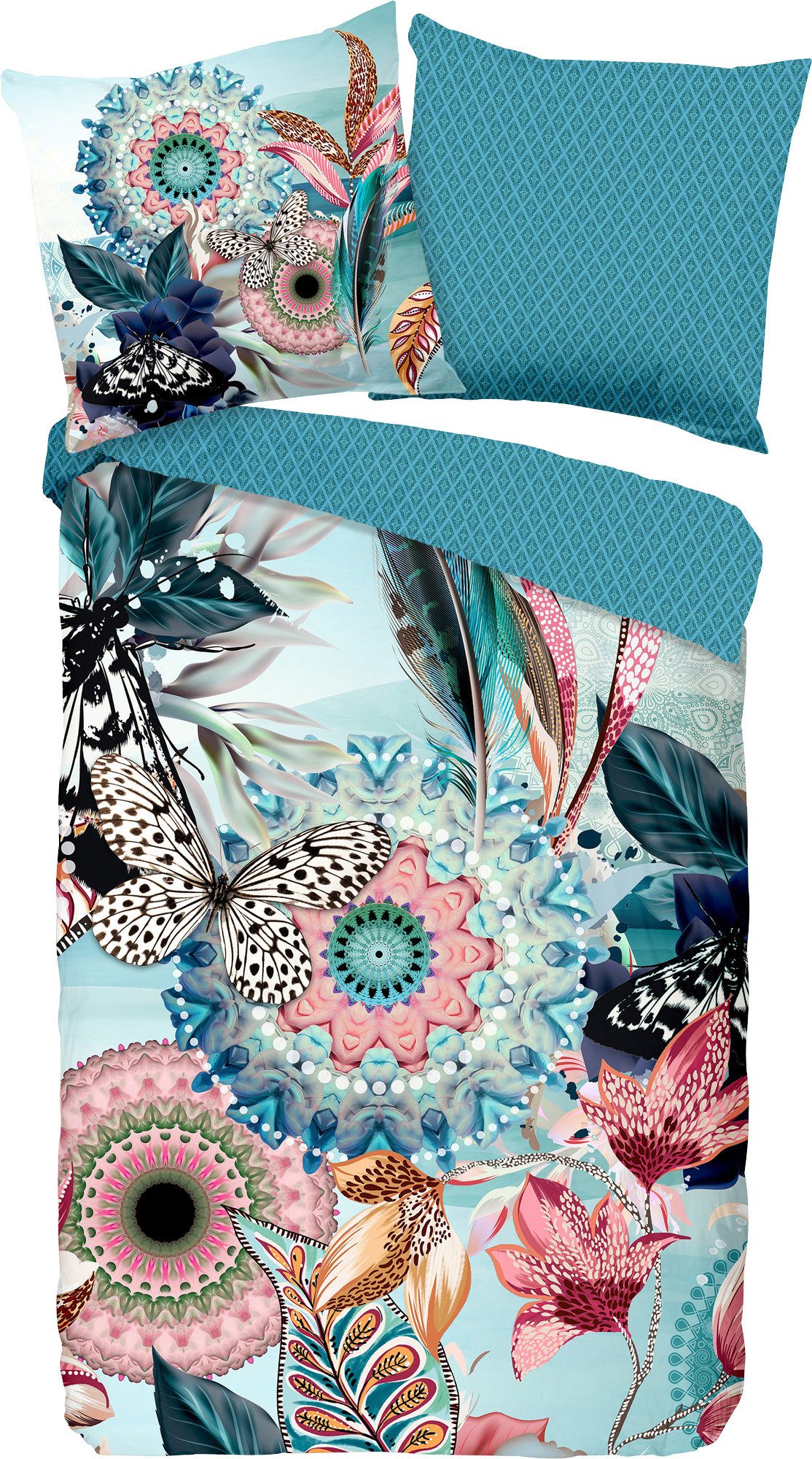 Hip Satin Wendebettwäsche "Maximilian". Exotische Blätter und Schmetterlinge verleihen den fantasievollen Mandalas den passenden Rahmen und inspirieren Ihre Sinne. Das Dessin steht im stimmigen Kontrast zur fein gemusterten Rückseite. Ein Augenschmaus, der Ihr Bett optisch in den Mittelpunkt rückt. Die feinfädige, glatte Qualität ist ein hautschmeichelnder Genuss. Sie verführt durch ihren seidigen Glanz und den anschmiegsamen Griff. Schnell bezogen dank praktischem Reißverschluss.