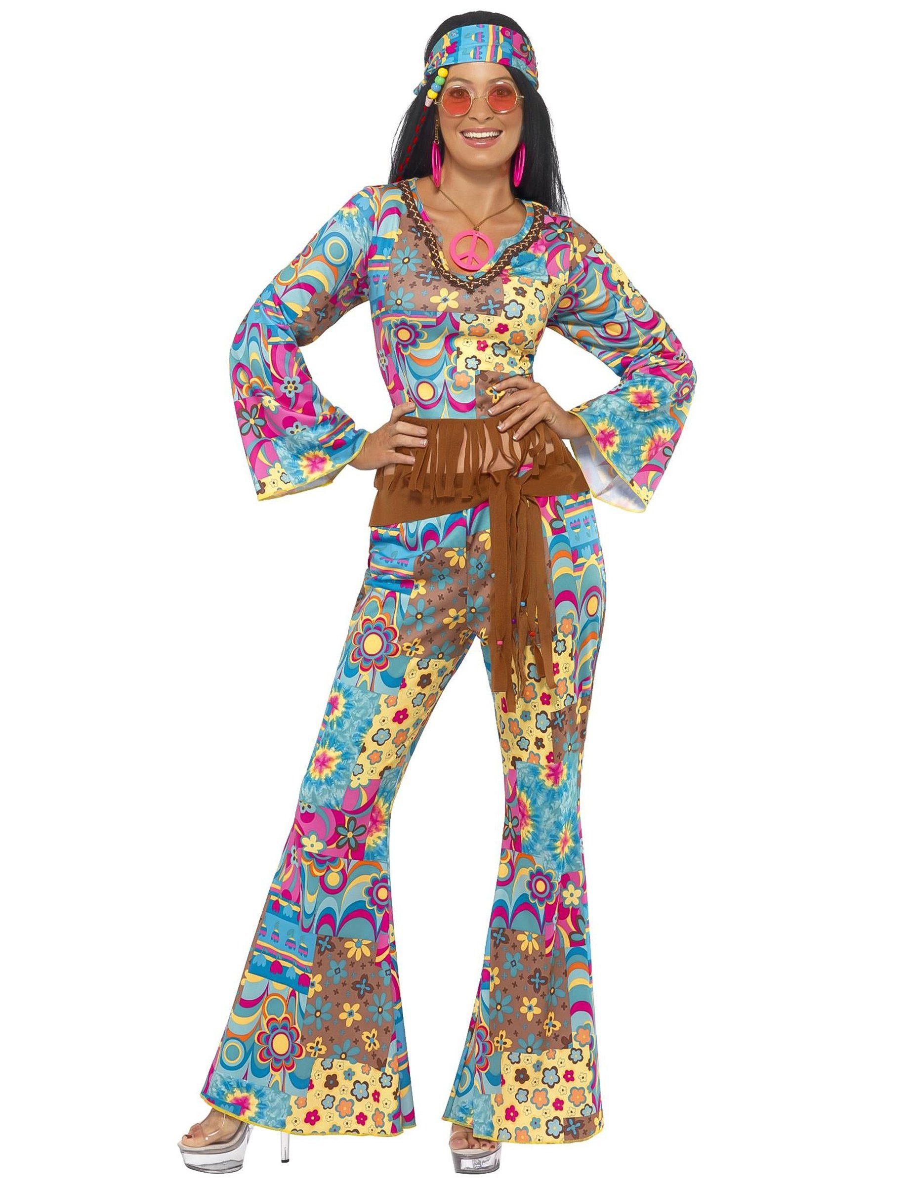 Wo diese Hippie-Dame auftaucht, werden sich sicher nicht nur die Herren staunend nach ihr umdrehen, die die 60er Jahre so sehr lieben wie sie - dieses Blumenkind ist eine wahre Augenweide! Mit dem vierteiligen Sixties Damenkostüm werden Sie zur Botschafterin von Liebe und Frieden! Das 60er Jahre Damenkostüm kommt mit einem langärmeligen Oberteil mit weit ausgestellten ärmeln, das am Saum mit braunen Fransen glänzt; durch diese kann man ab und zu einen neckischen Blick auf Ihren Bauch erhaschen. Die stilechte Schlaghose rückt Ihre Beine ins rechte Licht und wird noch getoppt von dem lässig umgeschlungenen Hüftgürtel in Braun. Sowohl die Kostümhose als auch das Kostümoberteil sind in einem bunten Blumenmuster gehalten. Das Stirnband im gleichen Design rundet das Hippiekostüm für Damen bestens ab. Mit diesem 70er Jahre Kostüm sorgen Sie garantiert für Furore auf der Hippie Mottoparty, zu Fasching oder einer Retrofete! Bei uns im finden Sie passende Herrenkostüme ebenso wie weiteres Hippie Kostümzubehör. Achtung! Nicht für Kinder unter drei Jahren geeignet. Kann Kleinteile enthalten - Erstickungsgefahr.