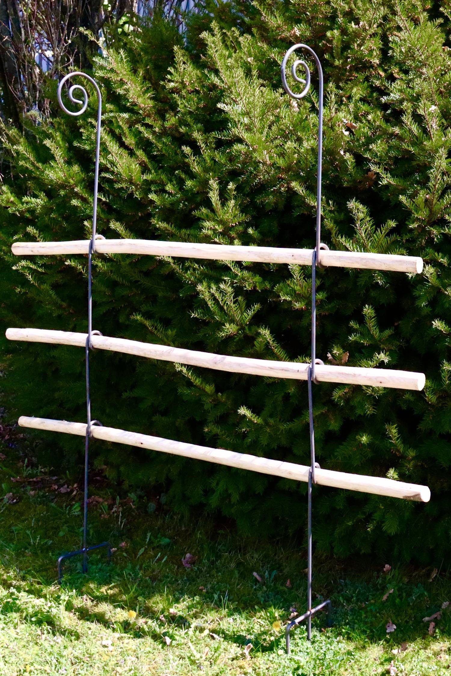 Rankgitter aus Holz und Metall in Edelrost Höhe 170 cm SET Unser Ziel war es eine Rankgitter zu entwickeln, welches sich durch eine stabile und robuste Verarbeitung sowie Beständigkeit gegen Wetter und Natur auszeichnet und dazu individuell eingesetzt werden kann. Das Rankgitter besteht aus zwei Knotenstangen und drei Holzstangen welche die Verbindung zwischen den beiden Stangen bilden. Die Metallstangen sind aus massivem und stabilen Vollmaterial gefertigt und sauber verschweist. Durch den 3-Fach Fuß an jedem Stab steht die Rankhilfe sehr stabil. Geliefert werden die Knotenstangen unbehandelt im Rohzustand so wird auf natürliche Weise im Laufe der Zeit Edelrost (Naturrost) ansetzten. Die Rankhilfe kann als Pflanzgitter für Kletterplanzen, Rosen, Himbeeren, Gurken, Tomaten usw verwendet werden. Darüber hinaus ist diese Rankhilfe sehr dekorativ und bereichert Ihr Beet oder Garten sicherlich! Einsatz Möglichkeiten für dieses Rankgitter gibt es zu genüge, sei es als Handtuchhalter an der Gartendusche oder am Pool. Auf die unterschiedlichen Verwendungen unseres Rankgitters sind wir in den По рейтингу sehr gespannt. Details: stabiles, freistehendes Rankgitter aus Vollmaterial Rundeisen 10 mm einfaches Zusammenstecken, keine Schrauben erforderlich Optik in Edelrost (Naturrost) geliefert wird im Rohzustand, die Rostpatina erhält das Rankgitter bei Ihnen im Garten Natürliche Materialien flexibel Einsetzbar Abmessungen Höhe: 170 cm Höhe ab Bodenkante 150 cm Schnecke oben: 16 x 14 cm Füsse unten: Höhe 20 cm, Breite 21 cm Knoten: Innen Ø 54 mm Abstand zwischen den Knoten 30 cm Knotenhöhe ab Bodenkante: unterer Knoten 40 cm mittelerer Knoten 70 cm oberer Knoten 100 cm Holzstangen: Длина ca. 150 cm, Durchmesser 3 - 5 cm Lieferumfang 2x Knotenstange mit 3-Fach Fuß 3x Holzstange ( da es sich um ein Naturprodukt handelt, können die Holzstangen trockenheits Risse haben)