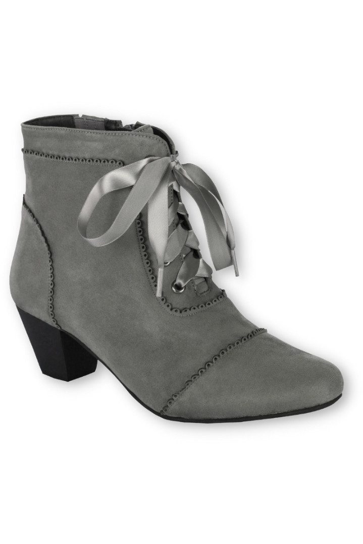 Die wundervollen Trachten Stiefeletten Franka von der Marke Hirschkogel sind süß und elegant zugleich. Sie bestehen aus weichem, robustem Velours-Material und haben zauberhafte Lochverzierungen mit welligen Kanten an der Vorderkappe, der Hinterkappe, um die Lochleiste und den Einstieg. Für die klassische Schnürung durch Ösen dient ein glänzendes Ton-in-Ton Satinband. Durch den seitlichen Reißverschluss an den Innenseiten ist ein schnelles Reinschlüpfen gegeben und der eingearbeitete Gummizug am Einstieg innen garantiert ein tolles Tragegefühl. Das gepolsterte Fußbett sorgt für einen bequemen Tragekomfort. Der fesche Trichterabsatz mit stilisierter Holz-Optik komplettiert die Kreation. Das Profil ist sehr fein und geriffelt. Die superschöne Stiefelette passt edel zur Tracht und lässt sich wunderbar kombinieren.