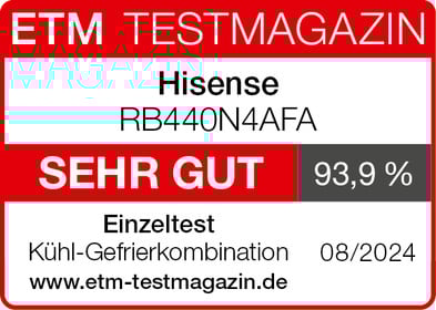 Der Hisense RB440N4AFA erzielt im Einzeltest des „ETM TESTMAGAZINS“ das Gesamtergebnis „sehr gut (93,9 %)“. Das Gerät ist einfach zu bedienen und hervorragend beleuchtet. Die umfangreiche Ausstattung glänzt u. a. mit „sehr guten“ Lagerungsmöglichkeiten und hochwertiger Verarbeitung. Außerdem punktet die „sehr gute“ Kühl- und Gefrierleistung. Insgesamt liefert das Modell „starke Qualität zum Sparpreis“.