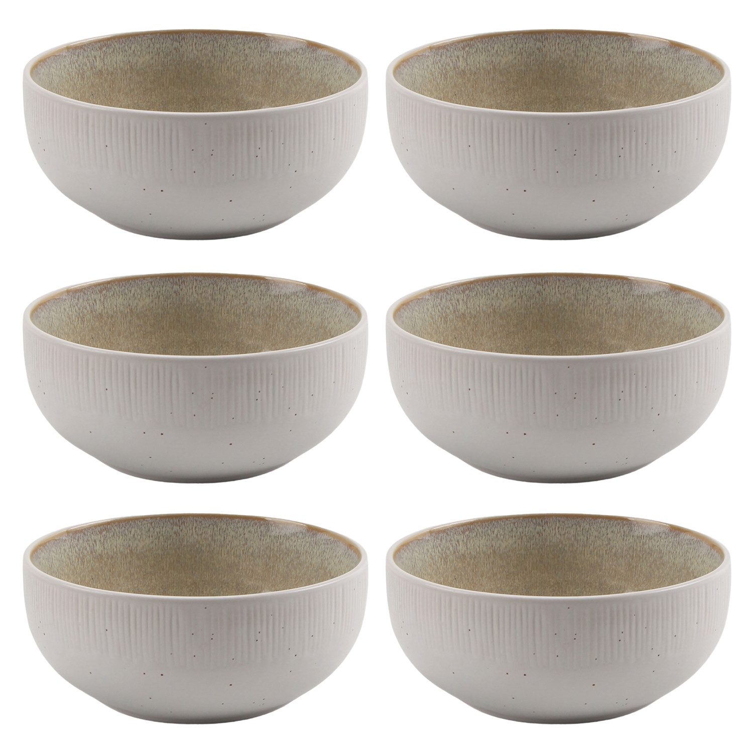 Die Müslischalen TIZIANA im 6er Set in Beige zeichnen sich durch linienförmige Reliefprägungen und glasierte Oberflächen aus Steingut aus. Mit je einem Durchmesser von 17 cm und je einer Höhe von 6 cm sind sie ideal für Frühstück oder Snacks geeignet. Die Außenseiten der Schalen sind in Weiß gehalten, was einen stilvollen Kontrast zur beigen Innenseite bietet. Die Schalen sind spülmaschinen- und mikrowellengeeignet, was sie besonders praktisch macht. Elegante und funktionale Begleiter für den täglichen Gebrauch.