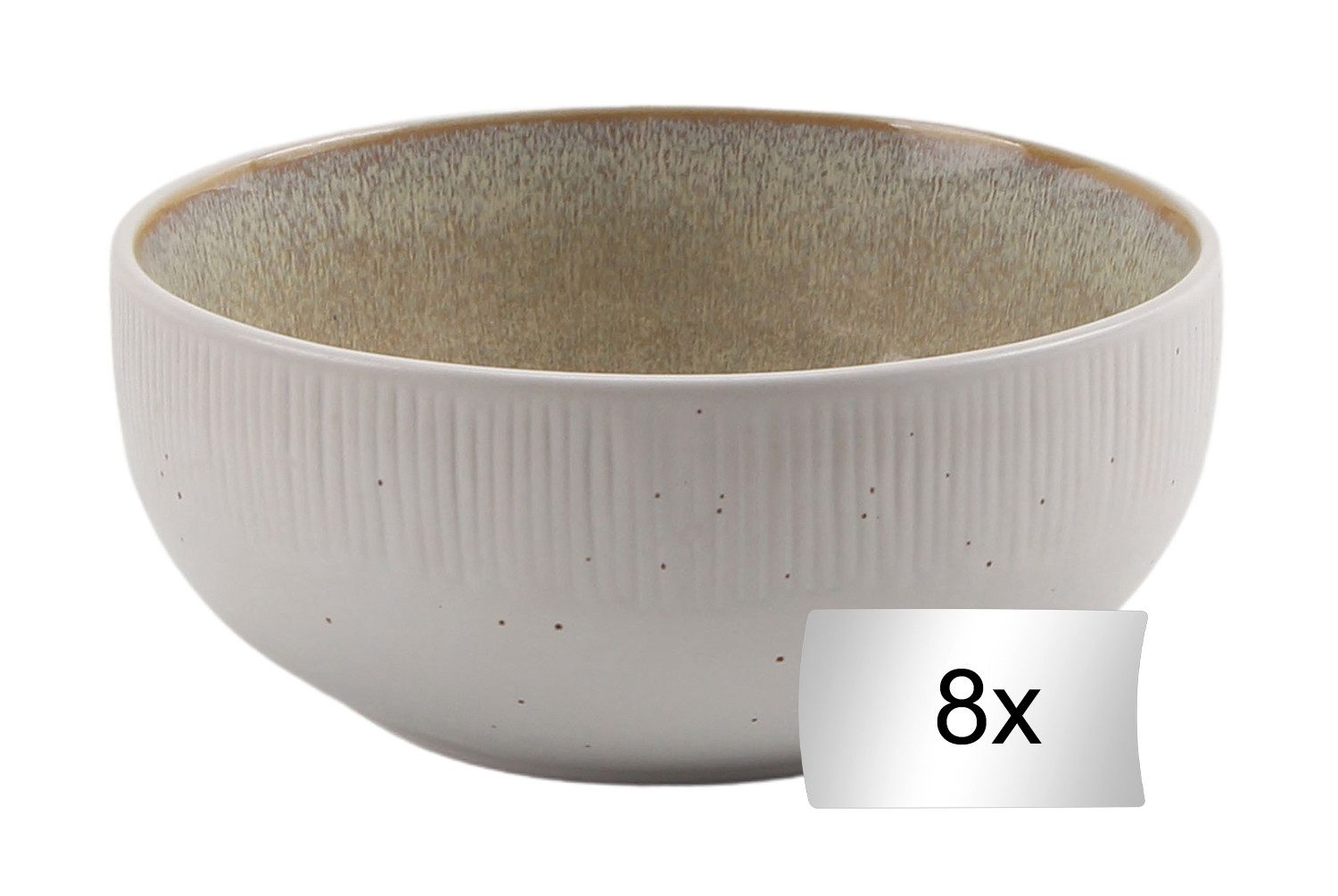 Die Müslischalen TIZIANA im 8er Set in Beige zeichnen sich durch linienförmige Reliefprägungen und glasierte Oberflächen aus Steingut aus. Mit je einem Durchmesser von 17 cm und je einer Höhe von 6 cm sind sie ideal für Frühstück oder Snacks geeignet. Die Außenseiten der Schalen sind in Weiß gehalten, was einen stilvollen Kontrast zur beigen Innenseite bietet. Die Schalen sind spülmaschinen- und mikrowellengeeignet, was sie besonders praktisch macht. Elegante und funktionale Begleiter für den täglichen Gebrauch.