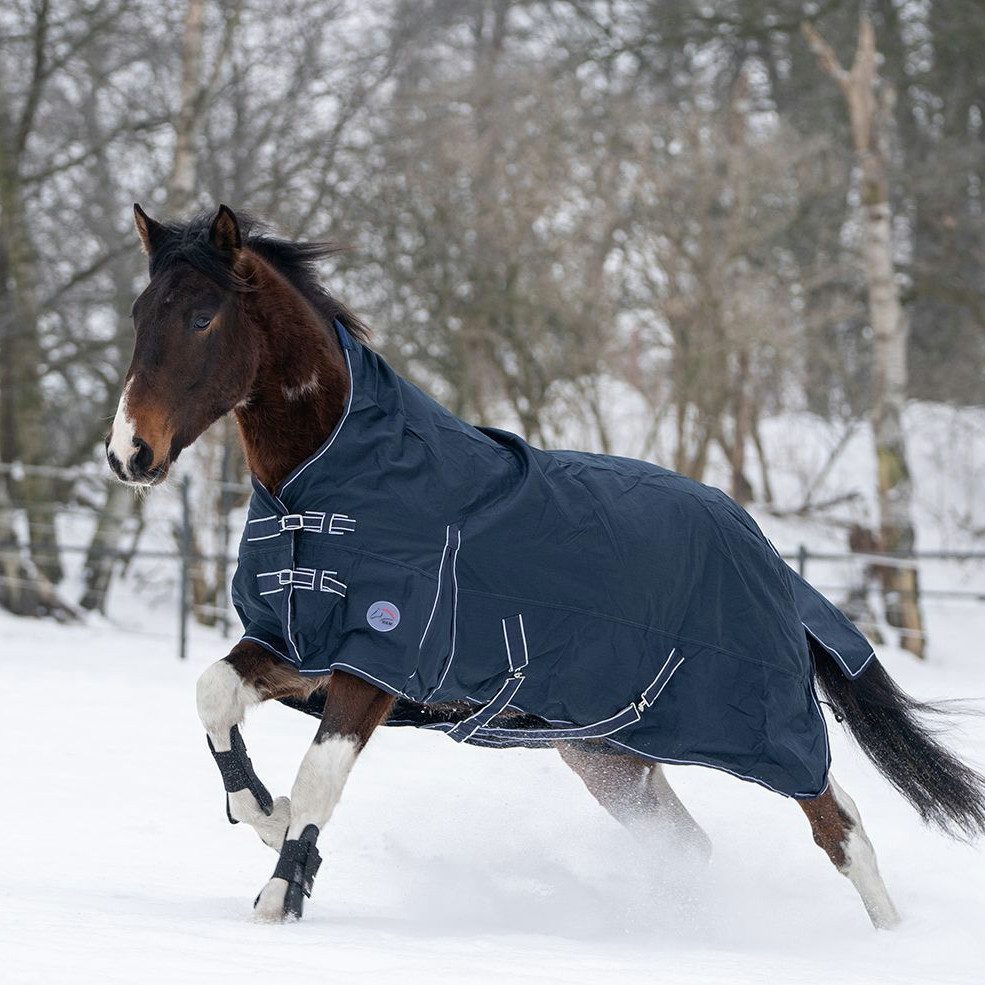 Die Decke besitzt einen abgepolsterten Widerrist. Der Highneck-Schnitt schützt vor Zugluft im Hals- und Brustbereich. Die großzügigen Gehfalten sorgen für hervorragende Bewegungsfreiheit. Die Decke wurde ohne Rückennaht gefertigt und verfügt zudem über einen großzügigen Schweiflatz.