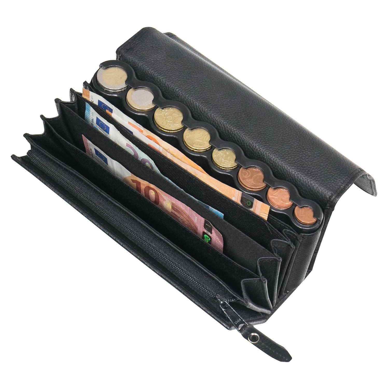 Ausstattung | 4 Geldscheinfächer, 1 Münzzähler, 1 Reißverschlussfach, 1 Tragegurt |