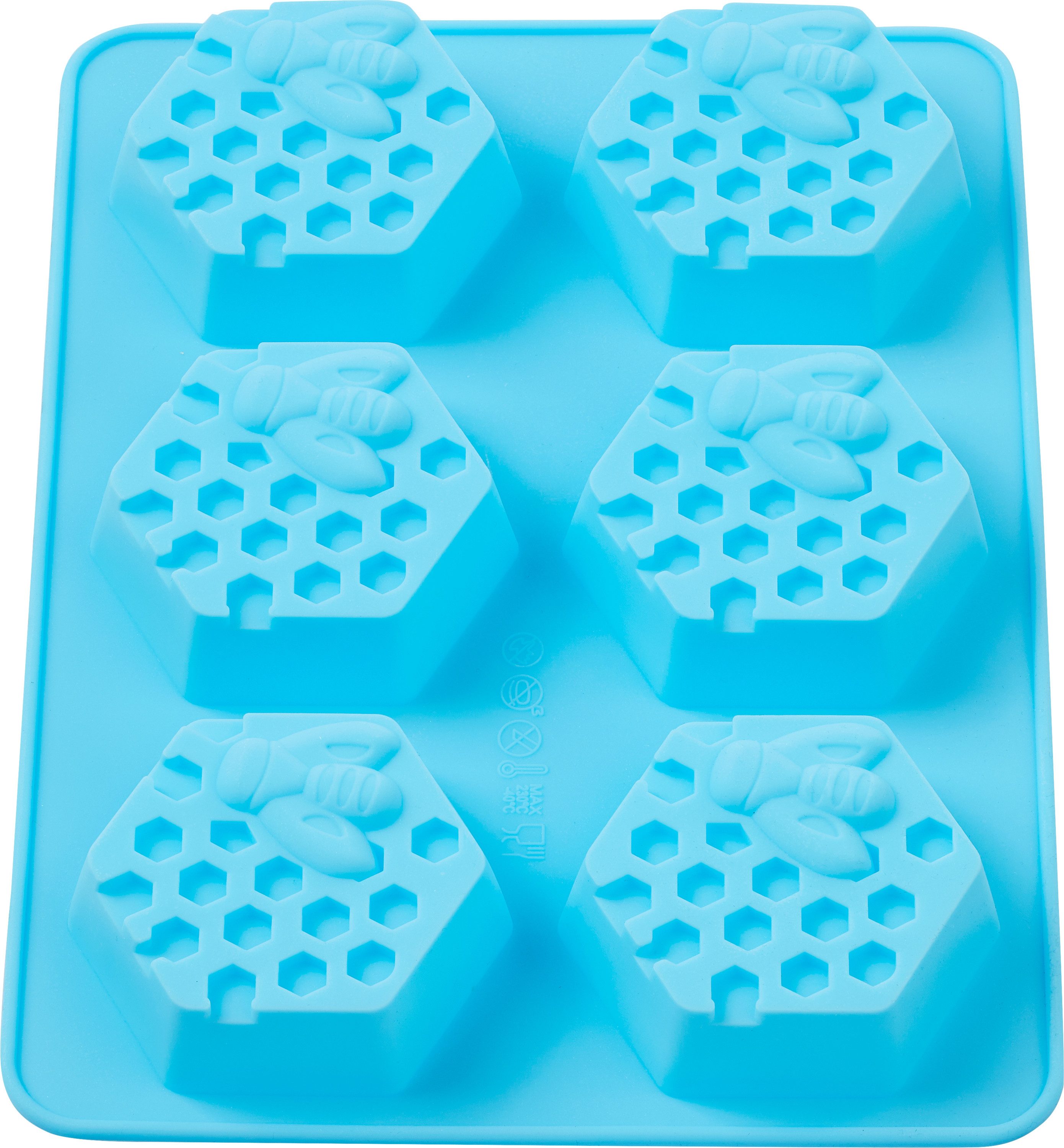 Silikon Gießform 'XL Bienenwaben', ca. 18,3 x 24,5 cm groß mit einer Höhe von ca. 2,5 cm und einer Gesamtfüllmenge von ca. 240 ml. Lebensmittelecht und hitzebeständig von -40 bis +240 °C. Die 6 detailreichen Waben sind mit einer Biene verziert und haben einen Ø von ca. 7,7 cm. Ideal zum Gießen kreativer Seifenstücke, die mit Duft, Farbe, Glitter und zarten Blüten individuell angereichert werden können. Die ausgehärteten Seifenkreationen noch nett verpacken und fertig ist eine liebevolle Geschenkidee.