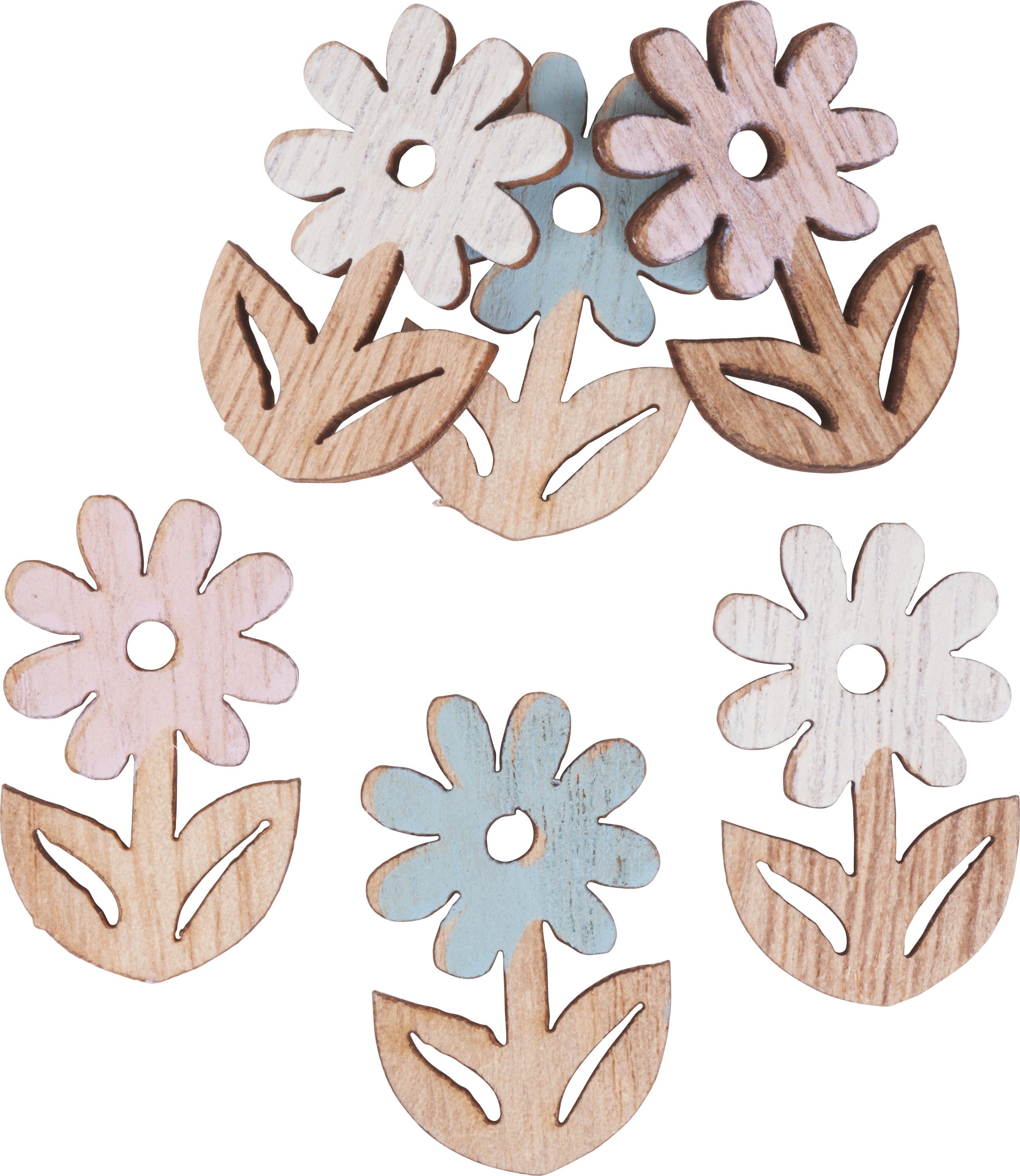 Mit diesen Streuteilen Blume 'Blanche' können Gestecke, Kränze und viele weitere Floristikarbeiten schick dekoriert werden. Durch den vorhandenen Klebepunkt lassen sich die Blumen, dessen Blüten in Pastellrosa, Pastellblau und Weiß gehalten sind, auch klasse zum Gestalten und Verzieren von Geschenkverpackungen, Grußkarten, Scrapbook-Alben und weiteren Kreativarbeiten verwenden. Die Blumen haben eine Размер von ca. 2,1 x 3,5 cm mit einer Stärke von ca. 3 mm. Jede Farbe ist 2-mal enthalten.