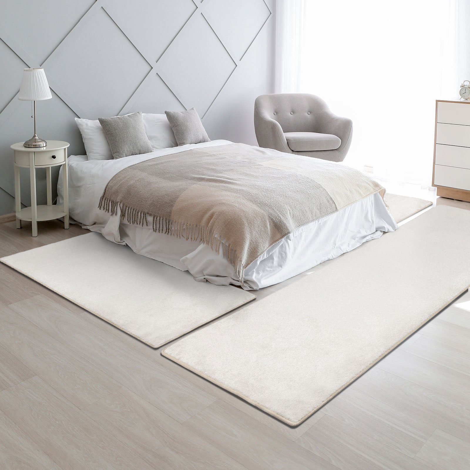 Die Velours-Bettumrandung besteht aus einem dreiteiligen Teppichläufer-Set. Während die beiden etwas kürzeren Teppichbrücken ihren Platz zur linken und zur rechten Seite des Bettes finden, rundet der lange Läufer das Gesamtbild an der Stirnseite perfekt ab.
