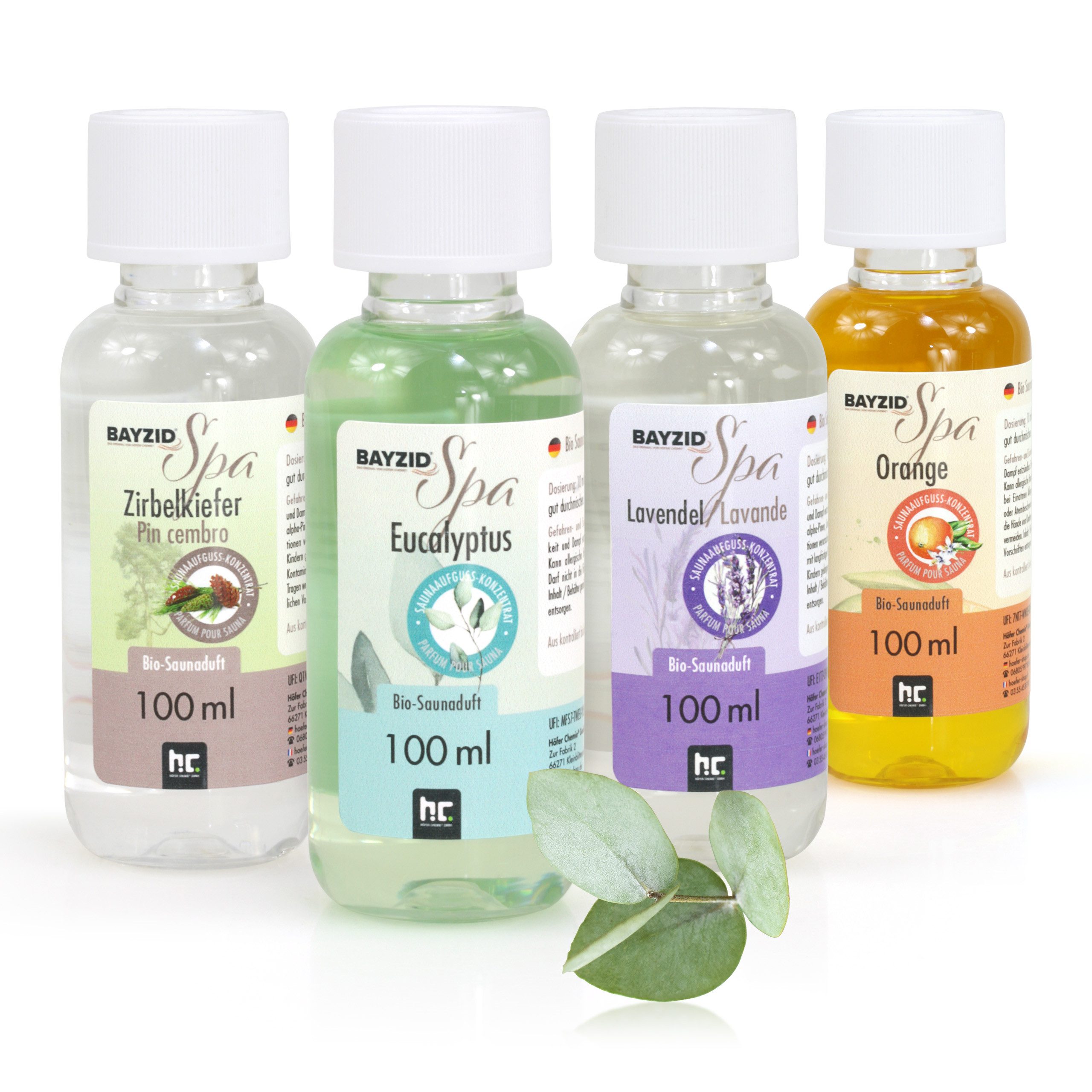 Mit dem Höfer Chemie Bio Saunaduft Set decken Sie alle Duftrichtungen ab, sodass aus Eukalyptus, Lavendel, Orange und Zirbelkiefer immer neue Eigenkreationen beim Saunaaufguss möglich sind. In der Erkältungszeit sind beliebte Düfte für Saunas mit minzigem Eukalyptusanteil sehr gut geeignet, in Kombination mit den weiteren BAYZID® SPA Duftklassikern erzielen Sie beim Saunagang immer den gewünschten Effekt! Was für Saunaduft von Höfer Chemie kauft man also am besten für die Bio-Sauna? Von vitalisierend orangig über ein anregendes Lavendelaroma bis hin zur erholsamen Entspannung im Zirbelkiefernwald ist alles möglich mit dem ergiebigen Probierset.