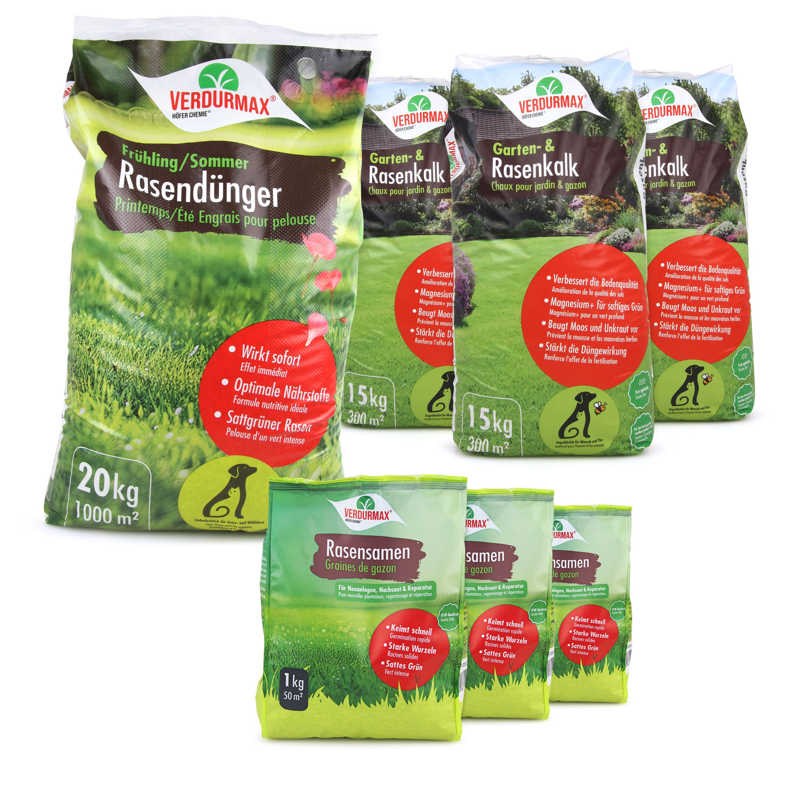 Bringen Sie Ihren Rasen im Frühjahr schnell auf Vordermann – mit dem VERDURMAX® Frühlings-Set. Es enthält alles, was Sie benötigen, um Ihrer Rasenfläche nach dem Winter wieder zu neuem Glanz zu verhelfen. Durch die Kombination aus Rasenkalk, speziellem Frühjahrsdünger und hochwertigen Rasensamen wird die Regeneration effektiv unterstützt und die Basis für einen gesunden, widerstandsfähigen Rasen gelegt.