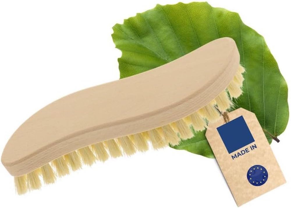 NATÜRLICHE ALTERNATIVE ZU KUNSTSTOFF: Die Reinigungsbürste ist besonders solide verarbeitet. Die Holzoberfläche ist glatt, die Borsten sind dick und verformen sich nicht. Sie sind im Holz fest verankert und fallen nicht aus