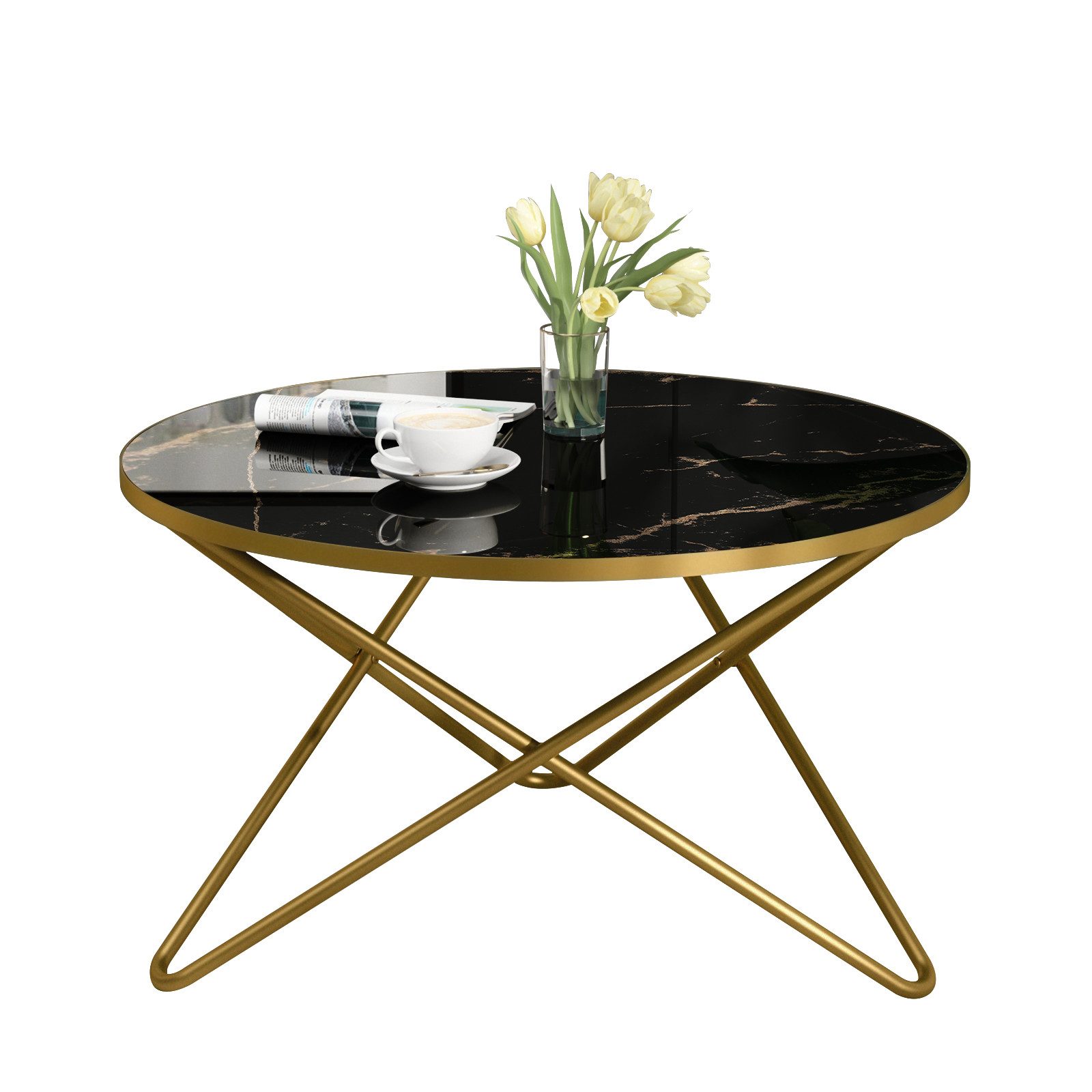 Stylischer & robuster Couchtisch mit Marmorglas – kombiniert elegantes Design aus glatter Oberfläche und marmoriertem Glaspanel. Stabiler Metallrahmen für Langlebigkeit, kratzfester Glasoberfläche für Pflegeleichtigkeit. Mit Ø 80 cm und H 46 cm bietet er perfekten Platz, das V-förmige Basisdesign sorgt für Standfestigkeit und zusätzlichen Stauraum.