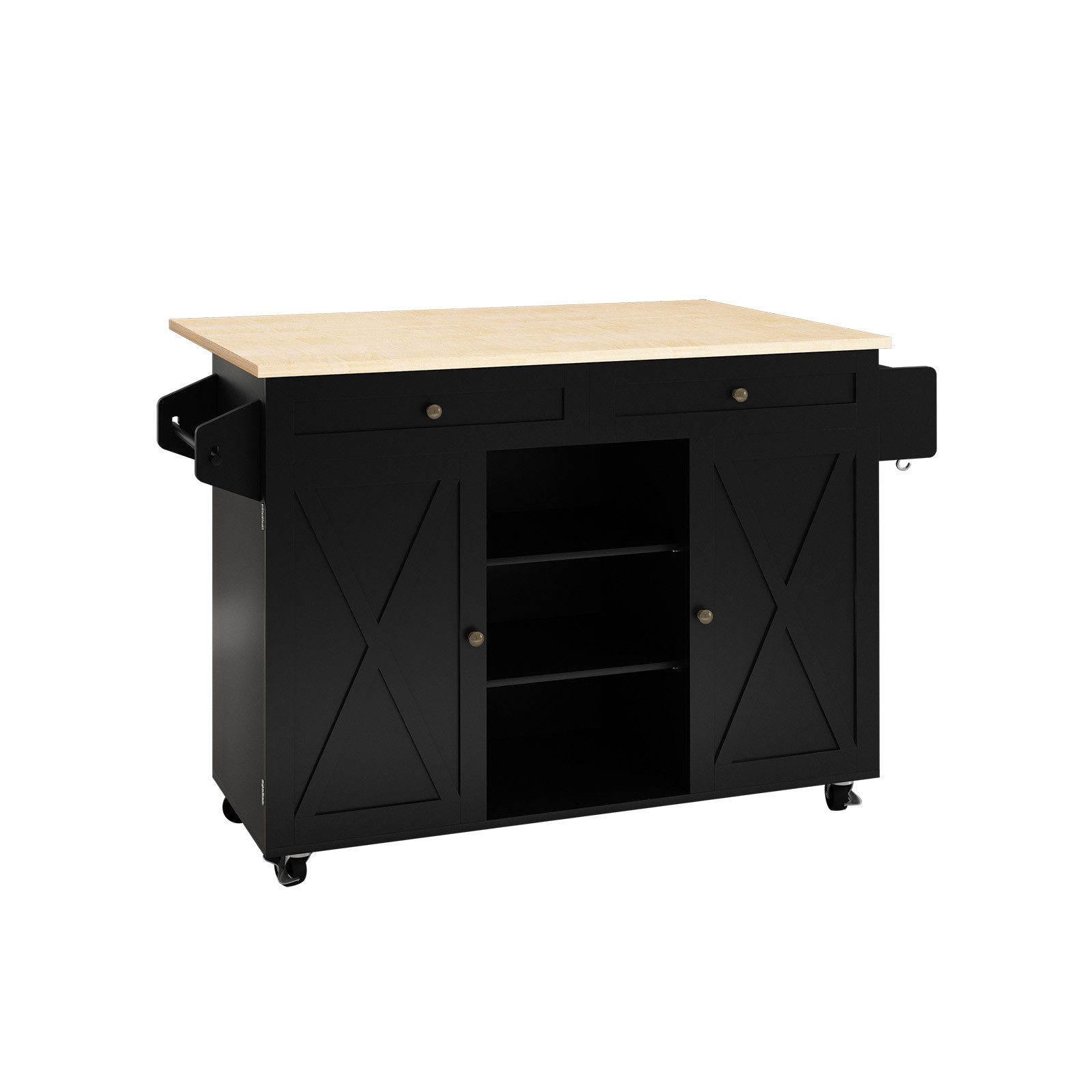 Mit 5 stabilen Rollen (inkl. Feststellbremsen) bewegen Sie die Insel mühelos. Riesiger Stauraum wartet in den beiden großen Fächern und auf den verstellbaren Regalen. Zusätzliche Ablage bieten die Handtuchstange und das Gewürzregal. Die pflegeleichte Gummibaum-Platte ist ideal für die Küche. Der einfache Aufbau gelingt dank beiliegender Anleitung problemlos – eine platzsparende Investition für mehr Komfort!