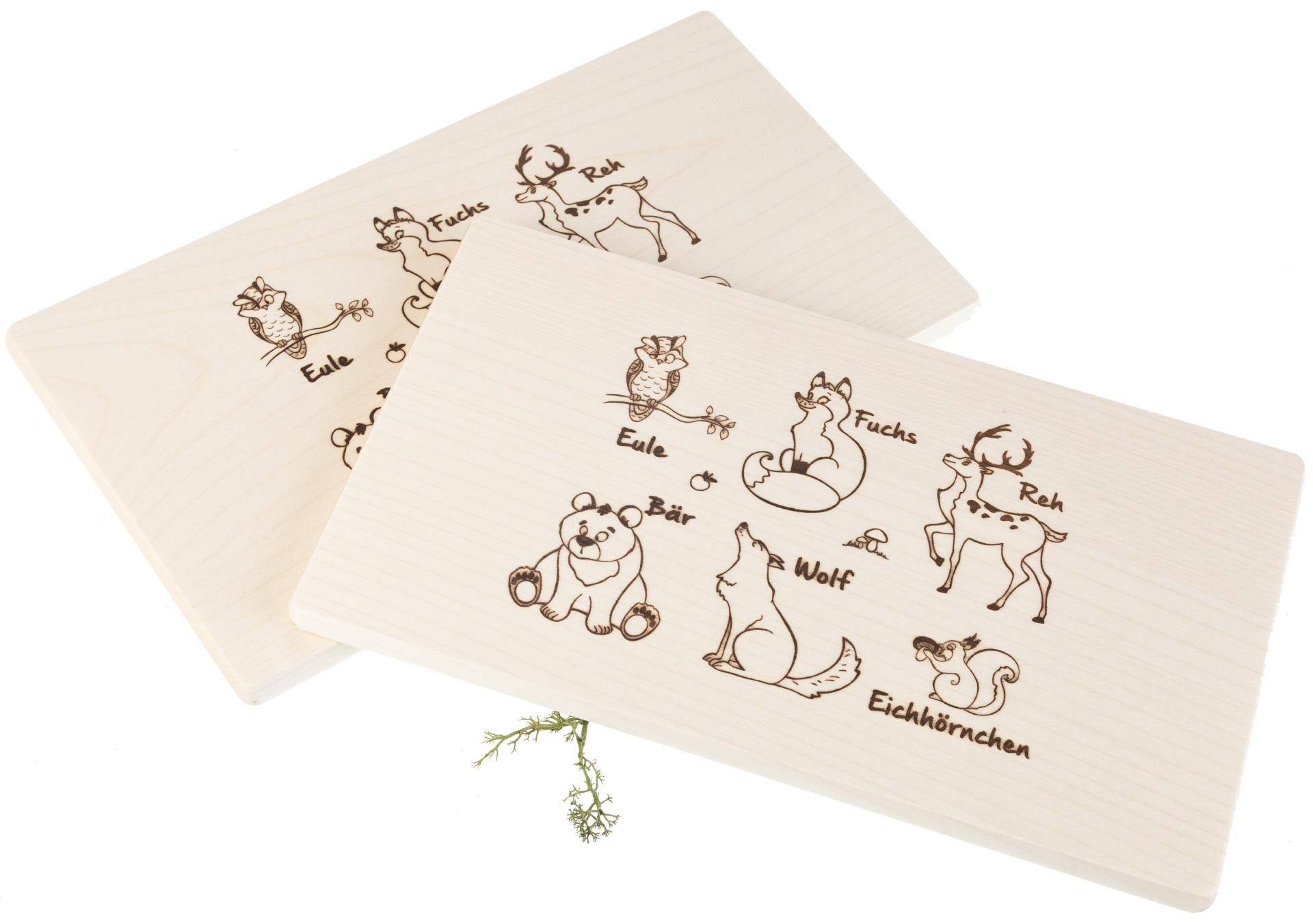 Das besondere Highlight: Ein fein eingebrannter Branddruck mit liebevoll gestalteten Waldtieren. Dargestellt sind Eule, Fuchs, Reh, Bär, Wolf und Eichhörnchen – jeweils mit ihrem deutschen Tiernamen. So lernen Kinder spielerisch erste Tierarten kennen und erkennen sie beim Frühstück wieder.