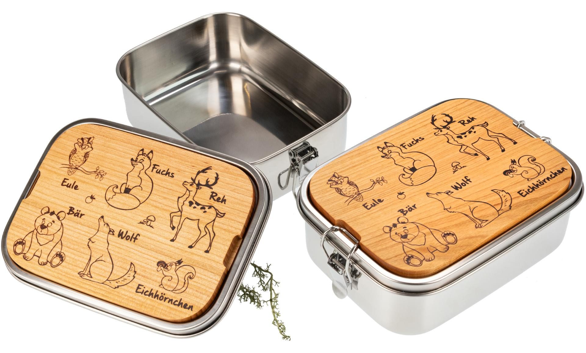 Entdecken, lernen, genießen: Diese Lunchbox aus Edelstahl mit einem massiven Kirschholz-Schneidebrett kombiniert Эко-товары mit kindgerechtem Bildungsanspruch. Das geölte Brett ist mit einem detailreichen Lernmotiv „Waldtiere“ versehen – inklusive Abbildungen und Namen von Eule, Fuchs, Reh, Bär, Wolf und Eichhörnchen.