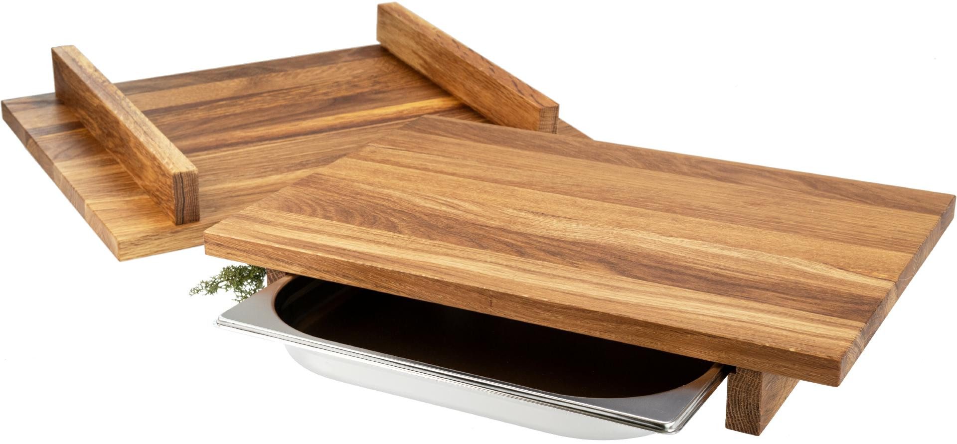 Ideal für jede Küche, ob zu Hause oder in der Gastronomie. Das Schneidebrett aus geölter Eiche mit Edelstahl-Auffangschale ist vielseitig einsetzbar, sei es zum Schneiden, Anrichten oder Servieren. Das elegante Design und die praktische Auffangschale machen es zu einem unverzichtbaren Küchenhelfer.