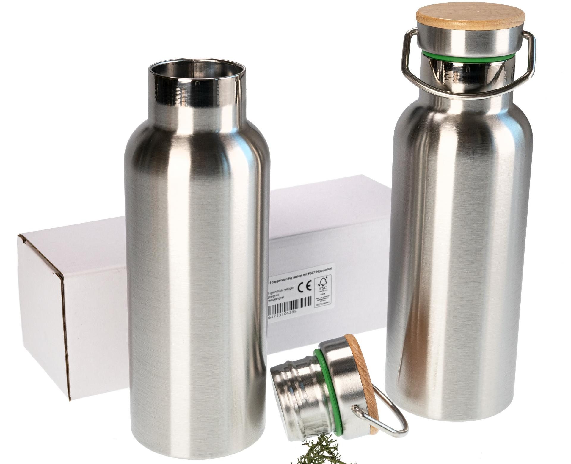 Diese elegante Edelstahl-Trinkflasche verbindet minimalistisches Design mit funktionaler Stärke. Die doppelwandige Isolierung hält Kaffee, Tee oder Wasser länger auf Wunschtemperatur – ideal für Büro, Schule, Sport und Reisen. Der FSC®-zertifizierte Holzdeckel setzt einen warmen, natürlichen Akzent und unterstreicht den nachhaltigen Anspruch.