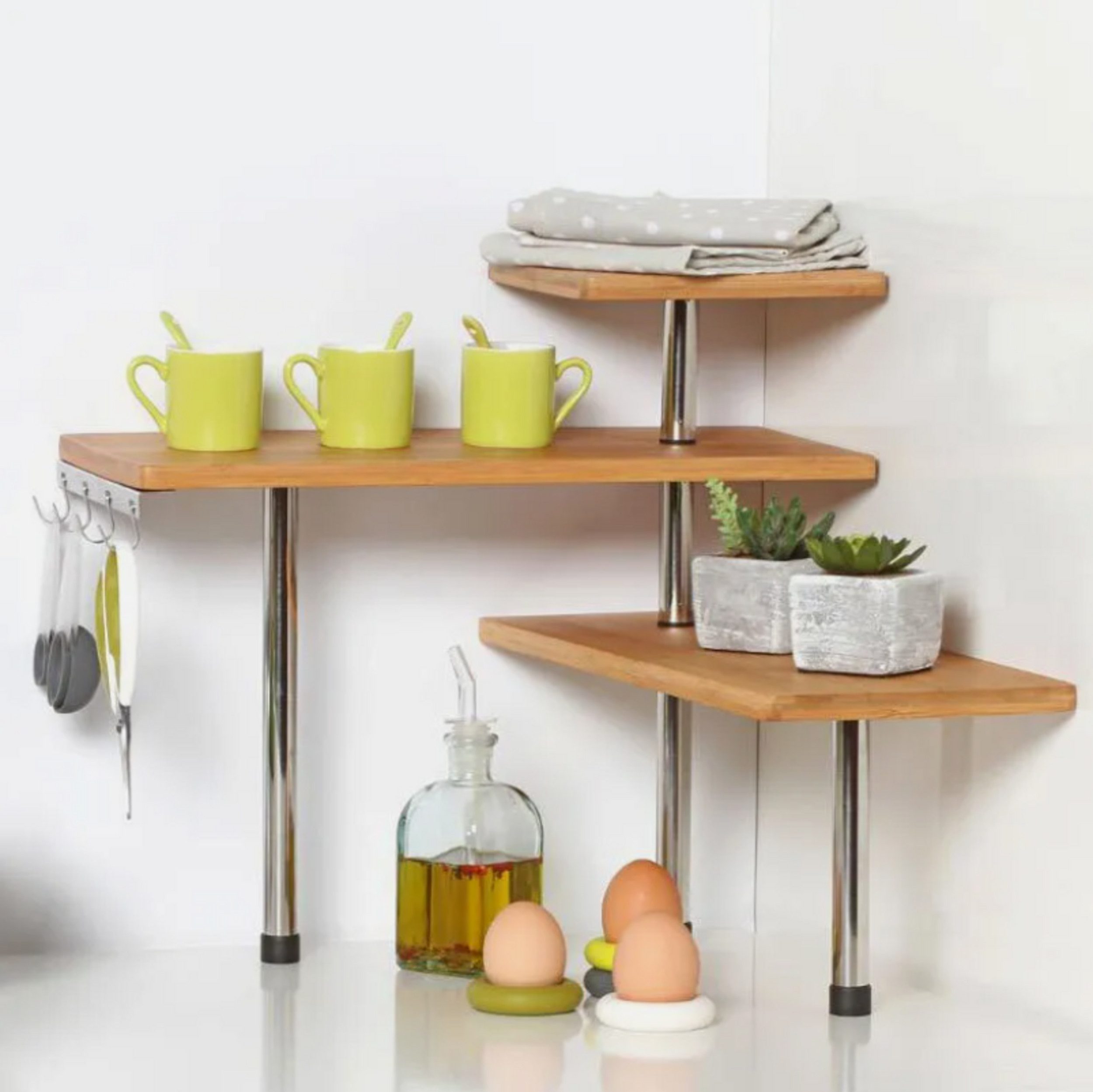 Das Küchen Eckregal aus Bambus ist ein praktisches und stilvolles Küchenregal, das speziell für die Ecken Ihrer Küche entworfen wurde. Es vereint funktionales Design mit natürlicher Optik und bietet eine ideale Lösung für die Aufbewahrung von Gewürzen, Küchenutensilien und anderen kleinen Gegenständen.
