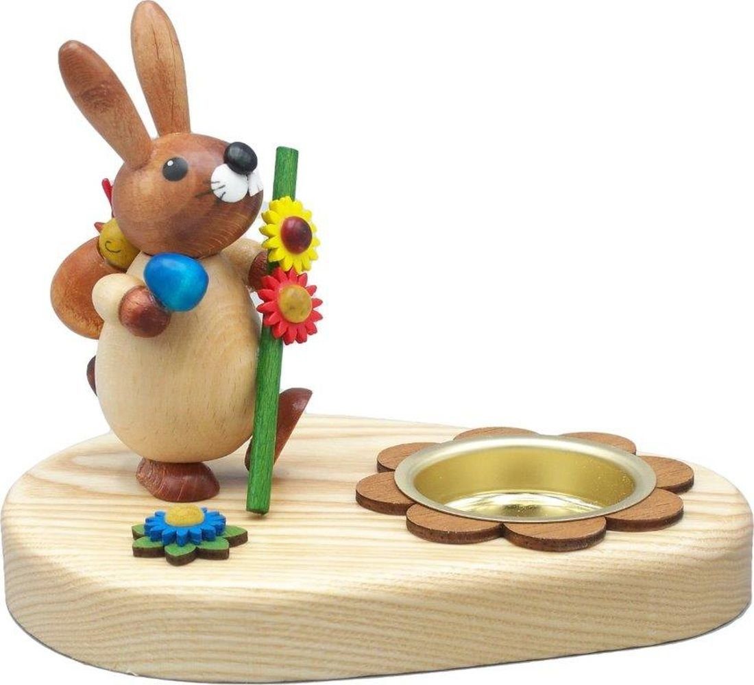 Osterdekoration Teelichthalter Hase mit Stock natur Dieser tolle Kerzenhalter hat eine Размер von 7 cm und ist komplett aus Holz gefertigt und natur gestaltet. Auf dem Sockel steht ein kleiner Hase und hält in der Hand einen Spazierstock. Daneben ist eine Holztülle mit Messingeinsatz für ein Teelicht. Der Kerzenhalter wird in verschiedenen Schritten komplett in Erzgebirge hergestellt BxHxT 10x7x7cm NEU |