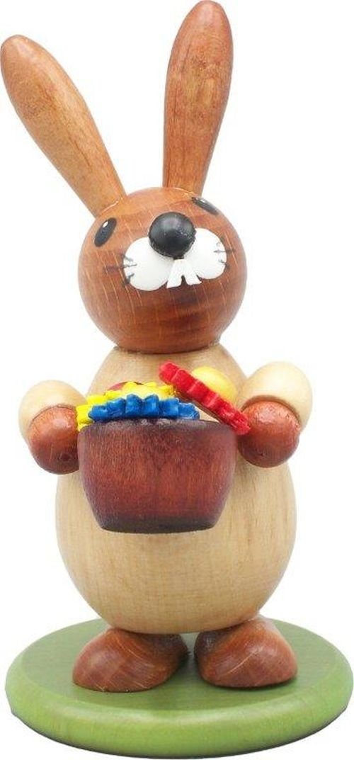 Osterdekoration Osterhase mit Blumen natur Dieser schöne Osterhase hat eine Höhe von 9 cm und ist natur gestaltet. Der Hase steht auf einem Sockel und hält in den Händen einen Korb mit Blumen. Всеs wird in verschiedenen Arbeitsschritten komplett aus Holz im Erzgebirge gefertigt Höhe 9cm NEU |