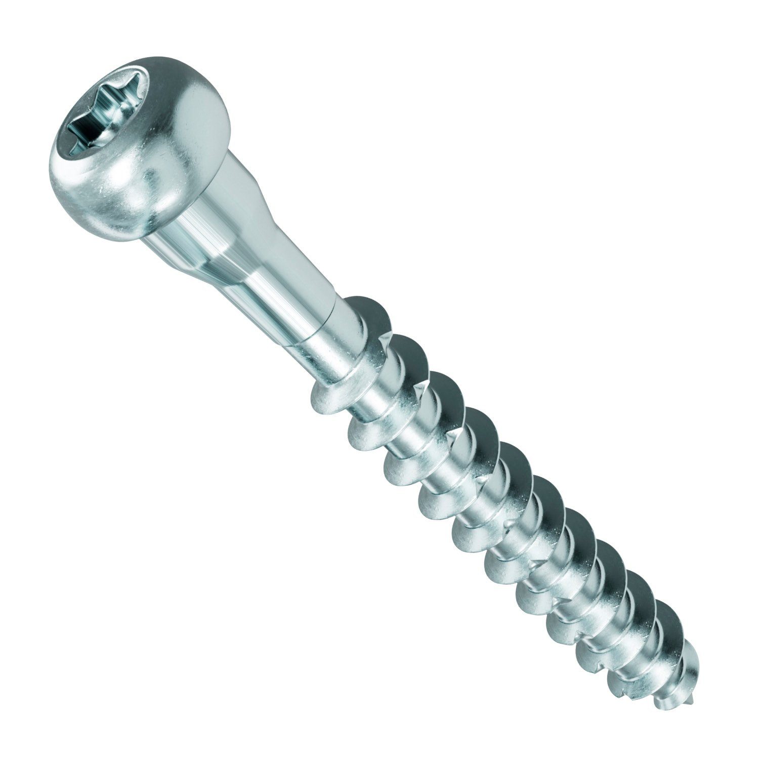 Der Pan-Head Schraubenkopf der Holzverbinder Schraube besitzt einen TX-20 Antrieb für eine besonders gute Kraftübertragung. Die gerade Auflagefläche auf der Unterseite des Schraubenkopfes gewährleistet einen hohen Anpressdruck und ist auf die genormten Lochdurchmesser der Holzverbinder abgestimmt. Das Vollgewinde mit Schaftansatz bietet einen höheren Ausziehwiderstand und so besonders festen Halt. So wird eine maximale Kraftübertragung der Schraube auf den Winkelverbinder gesichert.
