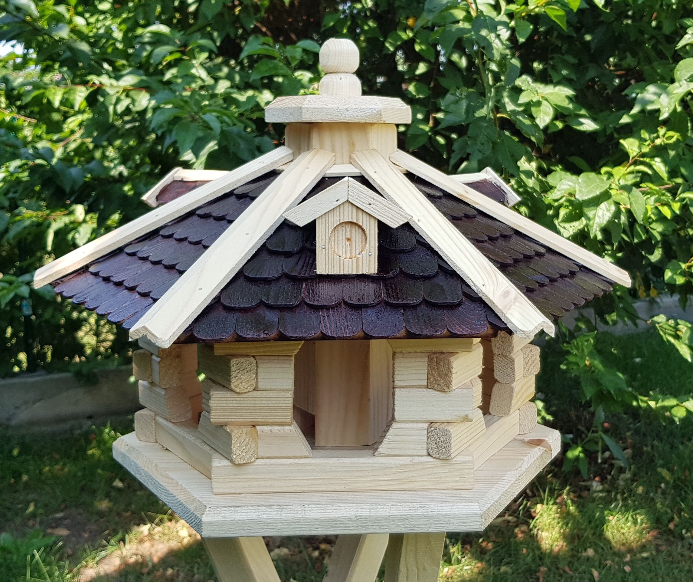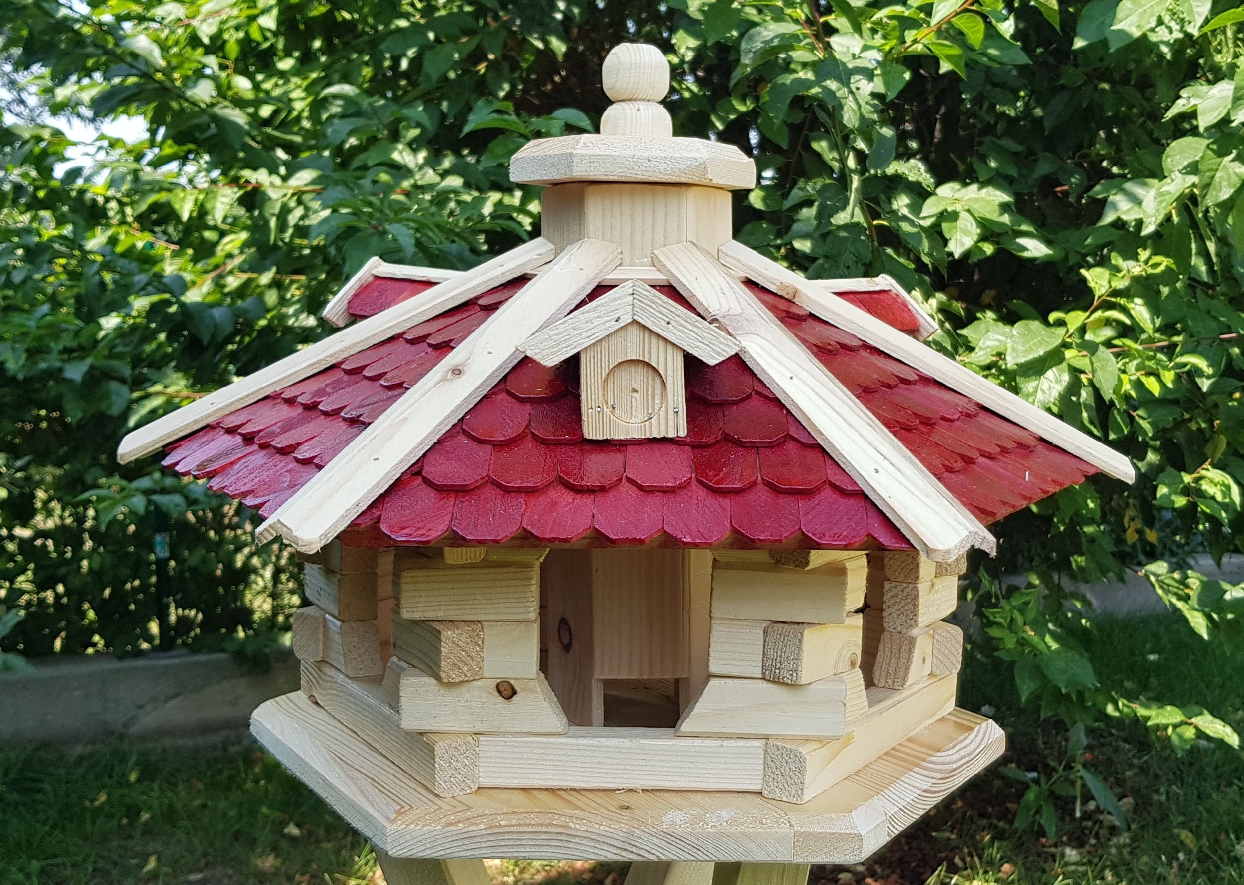 Ein qualitativ hochwertiges Vogelhaus mit aufwendig hergestellten Holzschindeln. Es ist aus massivem getrocknetem Nadelholz gefertigt. Das Vogelhäuschen ist in jede der 6 Richtungen offen, wodurch die Vögel von allen 6 Seiten an das Vogelhaus anfliegen und einfach landen können. Im Inneren des Vogelhauses befindet sich ein praktischer Futterdosierer. Man nimmt einfach die Dachspitze ab und füllt das Vogelfutter ein. Durch zwei gegenüberliegende Schlitze am Boden fällt das Futter nach und muss nicht täglich neu befüllt werden.Das Dach ist in verschiedenen Farben wählbar. Da nur das Vogelhausdach mit einem Farbanstrich versehen ist, ist es ratsam das restliche Vogelhaus noch mit einem Holzschutzmittel zu behandeln bevor das Haus im freien verwendet wird. Maße Vogelhaus: Dachdurchmesser: 48 cm Höhe: 33 cm