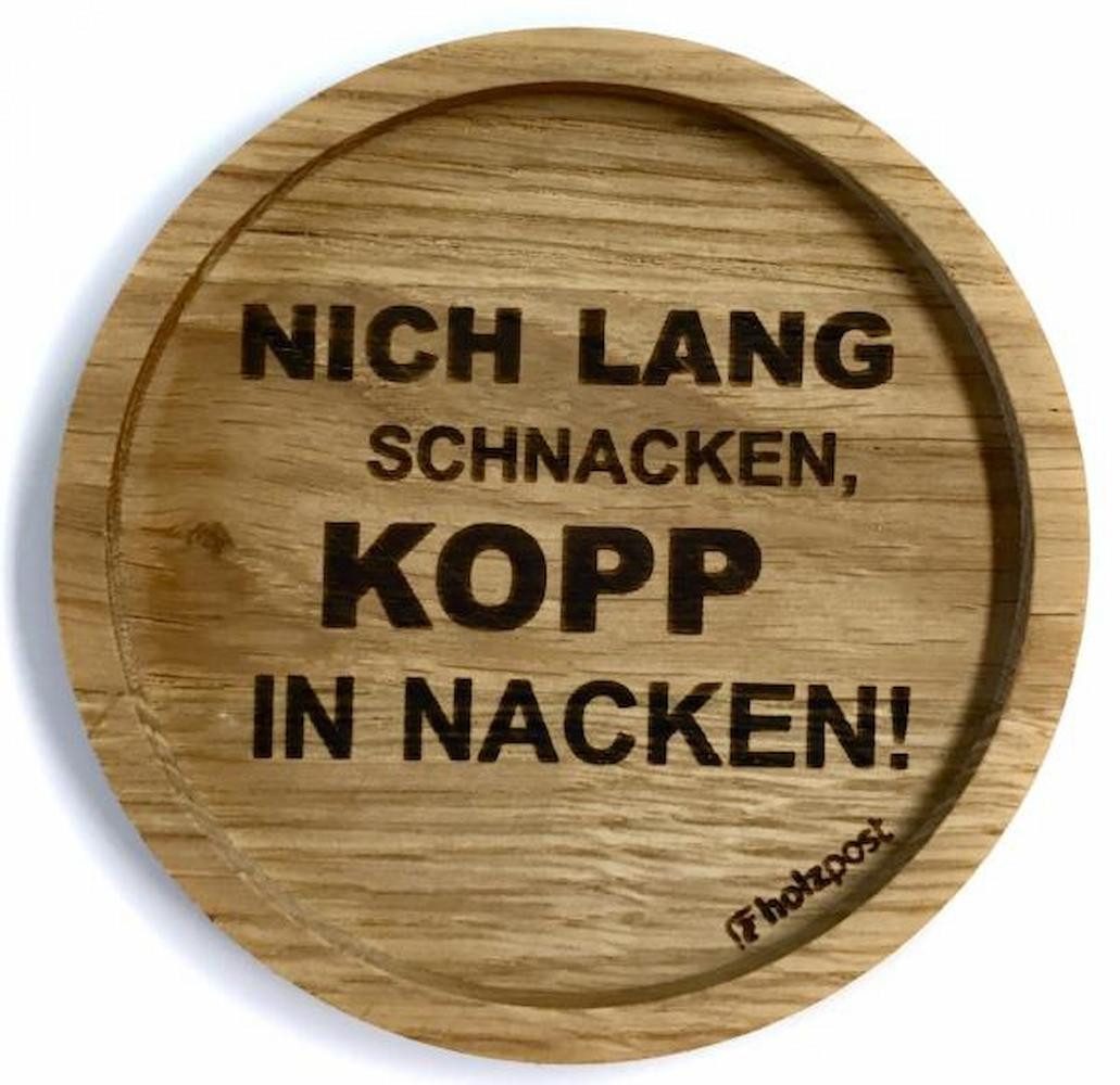 Der Untersetzer für Ihre Getränke: egal ob Bier, Wein, Kaffee oder Wasser - das kleine Geschenk, das langlebig ist und in Erinnerung bleibt! Sie suchen noch das kleine Geschenk oder Mitbringsel für einen Freund oder eine Kollegin? Mit unseren gravierten und geölten Untersetzern aus Eichenholz haben Sie es gefunden. Sie sind klimaneutral in Deutschland handgefertigt aus dem nachwachsenden, langlebigen Rohstoff Holz. Die lustigen Sprüche und Motive machen Freude und bringen den Beschenkten zum Schmunzeln. „Nich lang schnacken, Kopp in Nacken!“ Wer sagt eigentlich das Trinksprüche immer poetisch und stilvoll sein müssen? Genau, Niemand! Manchmal ist dieser bekannte Trinkspruch alles was man sagen (bzw. lesen) und wissen muss. Für den nächsten feuchtfröhlichen Abend ist dieser Untersetzer mit Sicherheit ein Hingucker und für den ein oder anderen Spaß gut. Und ganz egal wie lang der Abend wird, der Untersetzer schützt ihre Möbel ganz bestimmt vor unschönen und vor allem klebrigen Rändern. So lässt sich auch der Morgen danach entspannt genießen. Ein kleiner Spruch - viele Interpretationsmöglichkeiten. Vielleicht auch ein guter Start in ein abendliches Gespräch zwischen dem Gast, der dieses kleine Geschenk mitbringt, und dem beschenkten Gastgeber. Und der Beschenkte wird immer wieder an diese Gespräche denken, sobald er den Untersetzer in die Hand nimmt. Und das wird er sehr häufig tun, denn Eichenholz ist ein sehr langlebiger Werkstoff. Gewicht: 90 g Außendurchmesser: 11,2 cm Innendurchmesser: zwischen 10,0 cm und 10,1 cm Höhe des Randes: 8 mm gesamte Dicke: 20 mm
