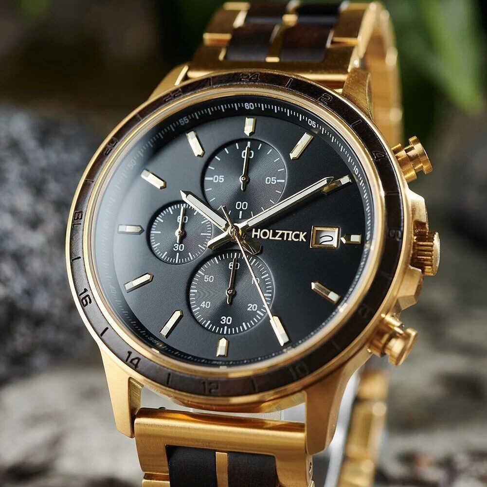 Besondere Merkmale | besonders edle Männeruhr aus Ebenholz und Edelstahl in Goldoptik |