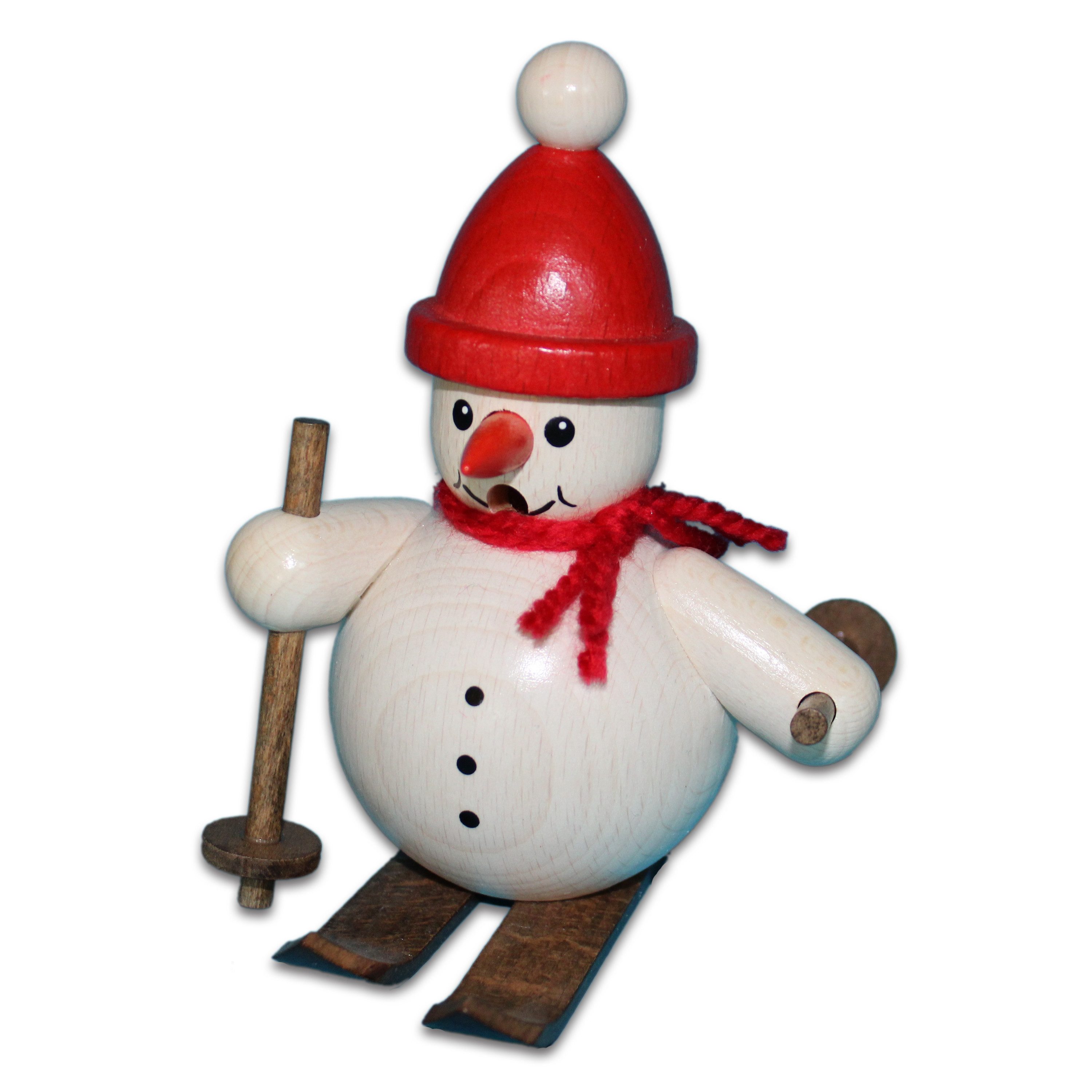 Der hölzerne Räuchermann in Form eines Schneemanns ist eine charmante, winterliche Figur, die sowohl dekorativ als auch ein Räucherkerzenhalter ist. Aus Holz gefertigt, strahlt der Schneemann eine traditionelle, handgefertigte Optik aus. Er besitzt ein paar Skier und die passenden Stöcke und trägt Hut und Schal in Rot.