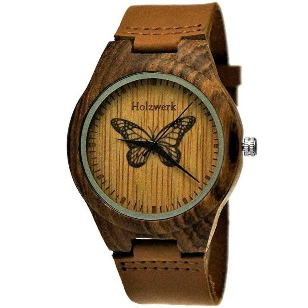 Die Holzwerk-Armbanduhr Modell: MONARCH aus Holz, überzeugt durch ein robustes Gehäuse, ein Ziffernblatt mit schönem Schmetterlingmuster und ein braunes Lederarmband. Damit ist sie ein modernes und modisches Accessoire für jeden Tag!