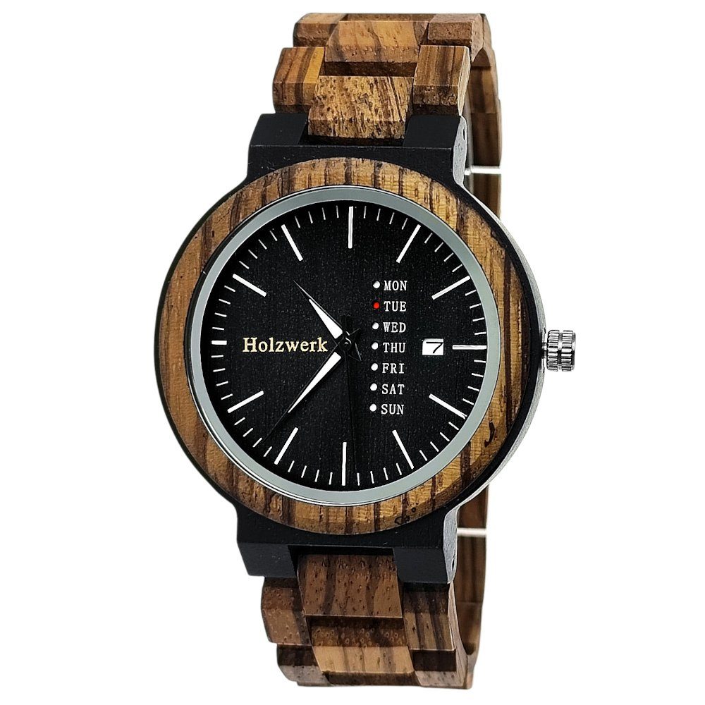 Die Holzwerk Armbanduhr Modell: OCHTRUP ist eine qualitativ hochwertige Holzuhr, die durch das einzigartige Holzgehäuse und -armband in Walnussbraun, sowie dem schwarzen Zifferblatt inkl. Datumsanzeige ein modernes und trendiges Design liefert.