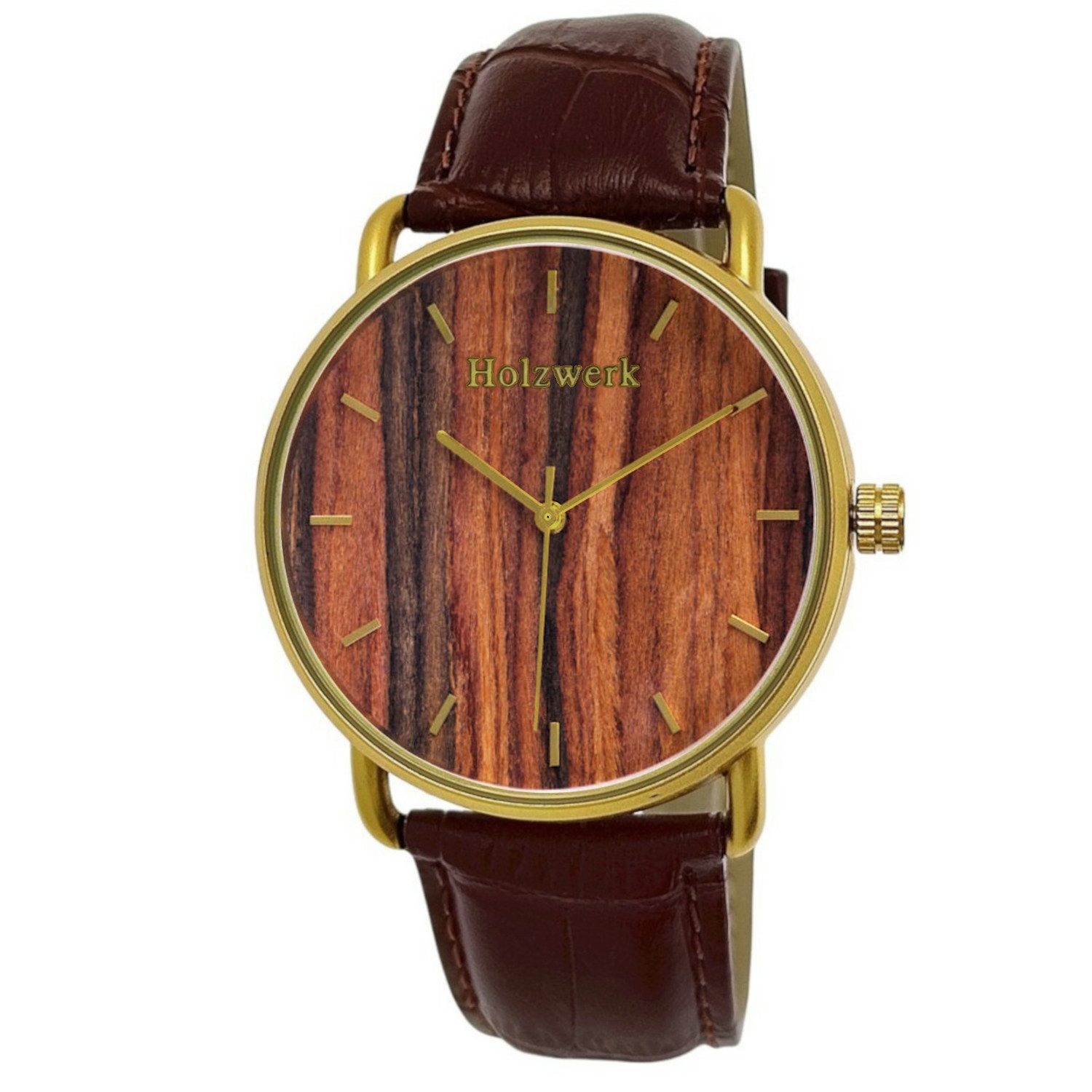 Verleihe deinem Look mit der Holzwerk-Armbanduhr Modell: SARSTEDT ein individuelles Upgrade. Mit dem schlichten einzigartigen Holzmuster versehen ist, und dem edlen Gehäuse aus Edelstahl in Gold sowie dem Lederarmband in braunem Kroko-Optik wird jeder Look zu einem modischen Highlight. Genieße eine klassische Eleganz, die niemanden kaltlassen wird!