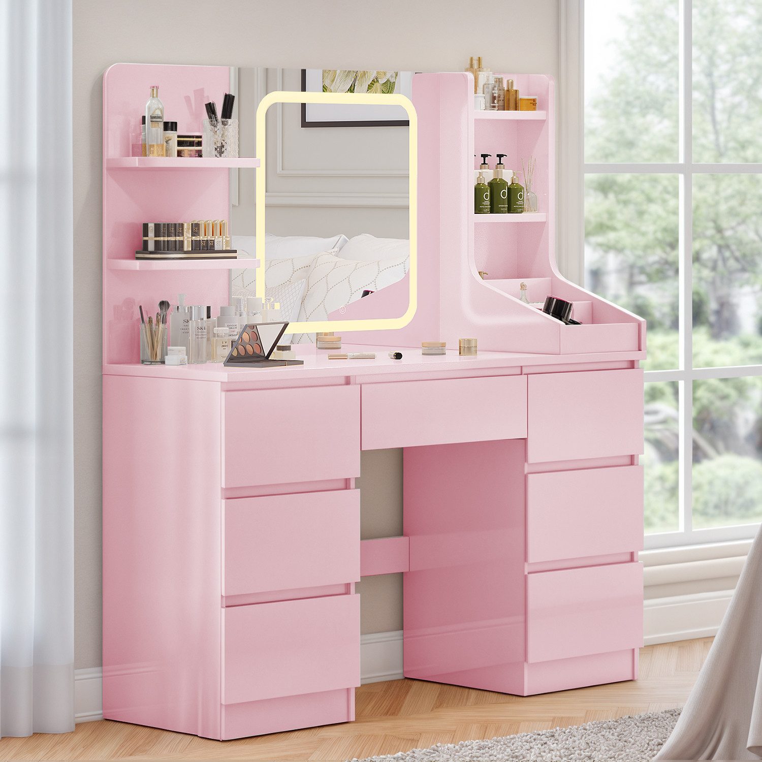 Jeden Morgen oder Abend können Sie sich an Ihren Schminktisch setzen und eine ganz besondere Zeit für sich selbst genießen. Die professionelle LED-Leiste mit drei Farbtemperaturen (kaltes Licht/natürliches Licht/warmes Licht) sorgt für präzises, unverfälschtes Licht und eine perfekte Wiedergabe der Farben. 7 große Schubladen + 8 multifunktionale Ablagefächer auf der Tischplatte bieten Platz für Hautpflegeprodukte, Make-up-Paletten, Pinsel, Schmuck und Kleinigkeiten. Das gesamte Möbelstück besteht aus hochwertigem, verstärktem E1-zertifiziertem umweltfreundlichem Material, ist stabil und zuverlässig und verfügt über eine leicht zu reinigende Oberfläche, die sich mit einem einfachen Wisch säubern lässt – das spart Zeit und Mühe.