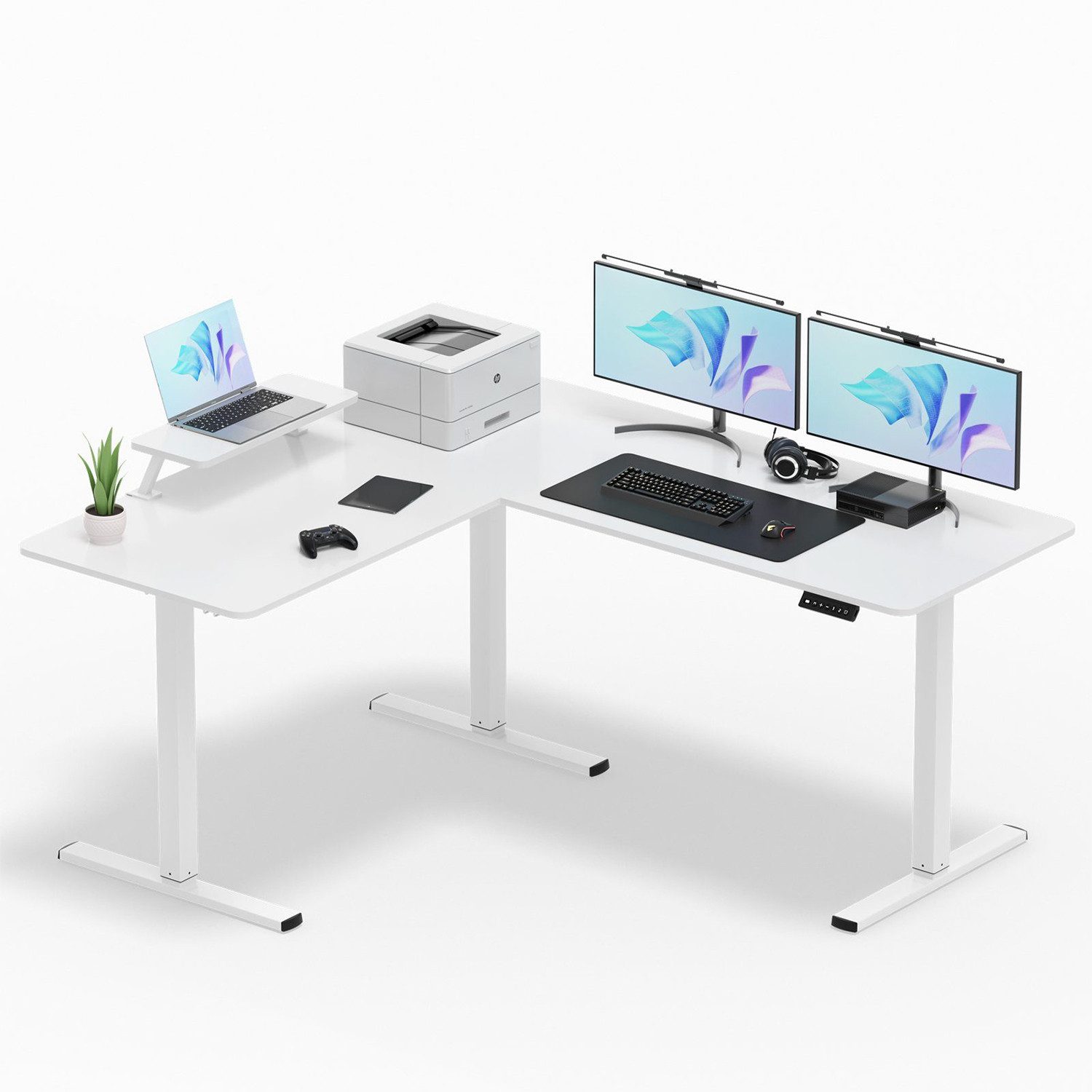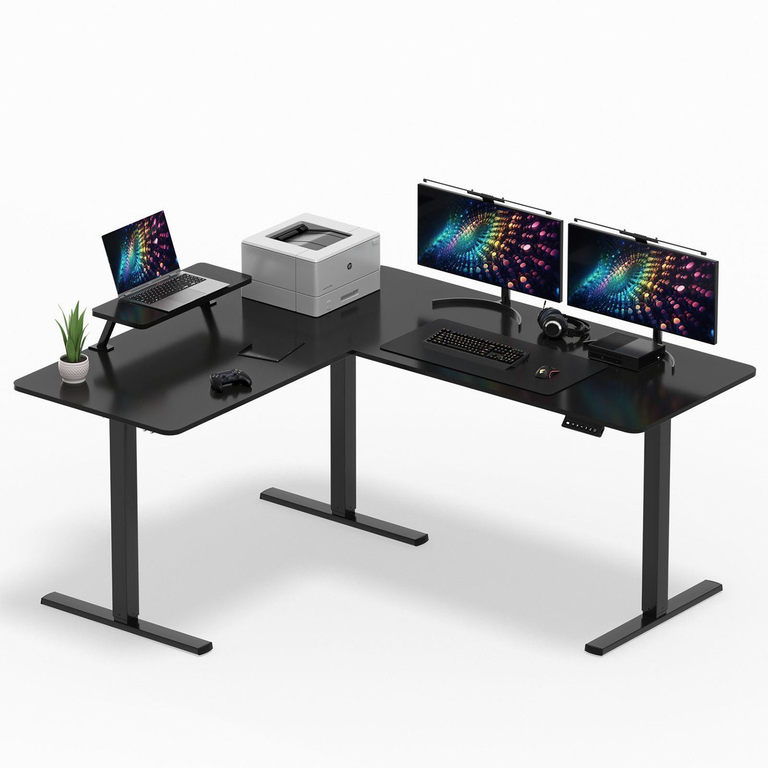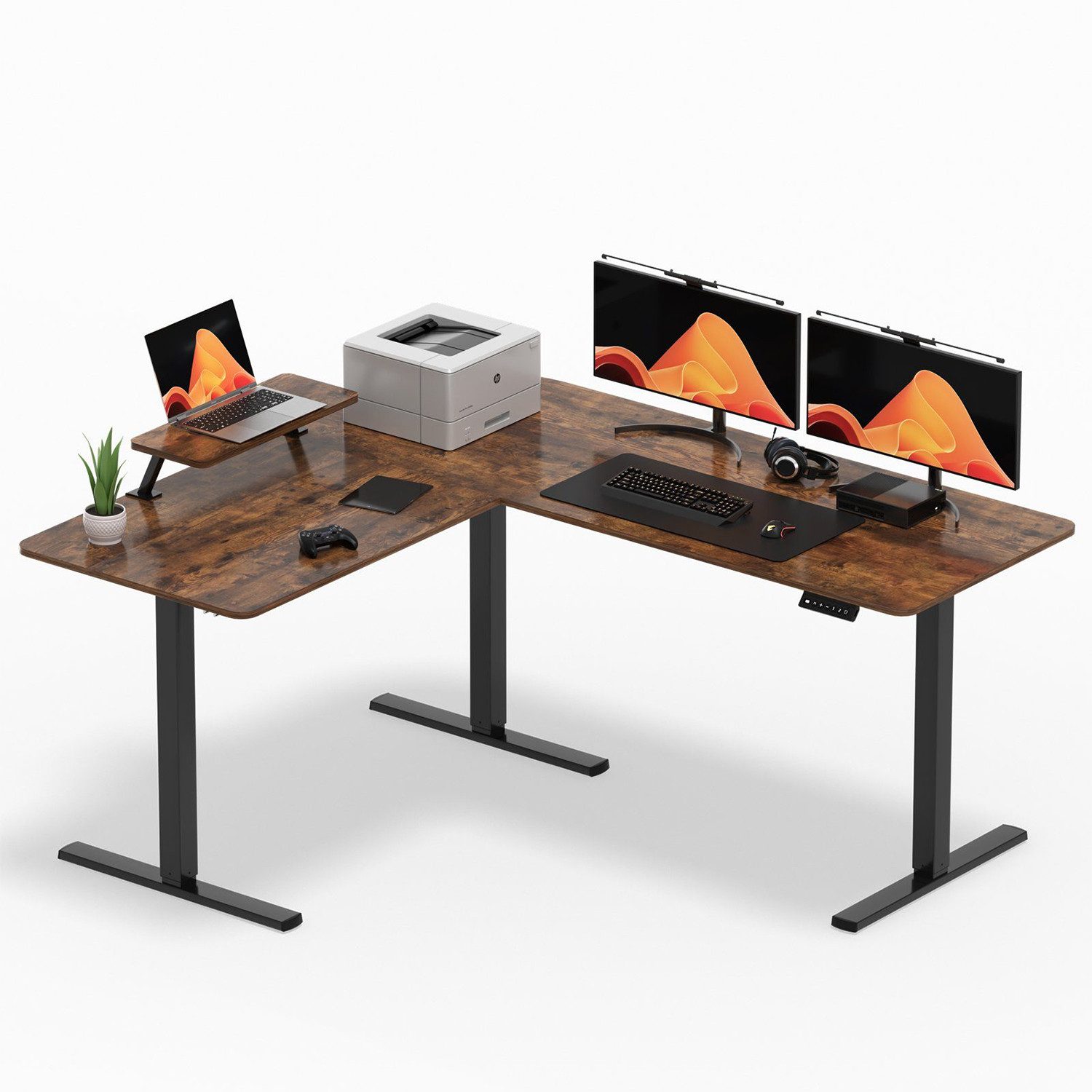Der höhenverstellbare Eckschreibtisch spart Platz, indem er die Wandecken optimal ausnutzt. Der L-förmige höhenverstellbare Schreibtisch verfügt über 2 vorgewählte Tasten und kann von 73 cm bis 116 cm angehoben oder abgesenkt werden.Getragen wird der motorisch höhenverstellbare Schreibtisch von einem stabilen Metallgestell aus Industriestahl mit einer Tragkraft von 80 kg.Die L-förmige, wendbare Arbeitsfläche von 160 cm x 140 cm ist links und rechts nutzbar und bietet insbesondere mit den Monitorablagen viel Platz für mehrere Monitore.Eine Kabelmanagementbox ist als Zubehör im Lieferumfang enthalten. Schwenkbare Rollen drehen sich um 360 Grad und machen den L-förmigen Schreibtisch mobil. Funktioniert mit oder ohne Rollen. Enthält außerdem seitliche Haken für Kopfhörer und Zubehör. Das L-förmige Stehpult wird mit einer ausführlichen Montageanleitung und einem sofortigen Kundendienst geliefert. Bitte kontaktieren Sie uns, wenn Sie irgendwelche Fragen haben. Unsere Kundendienstmitarbeiter werden sich innerhalb von 24 Stunden bei Ihnen melden.