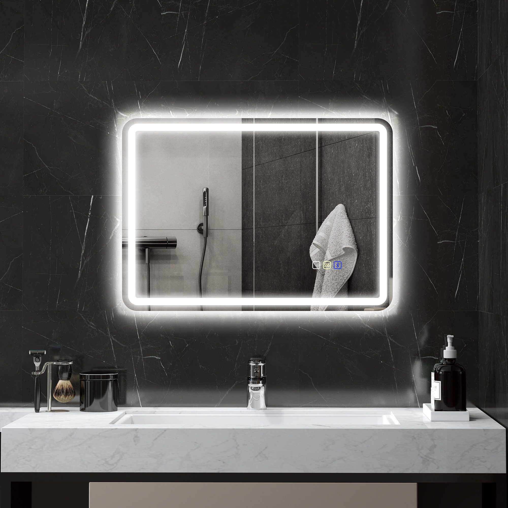 Lieferumfang | 1 x Badezimmerspiegel, 2 x Schraube, 2 x Dübel, 1 x Anschlussdose, 1 x Bedienungsanleitung |