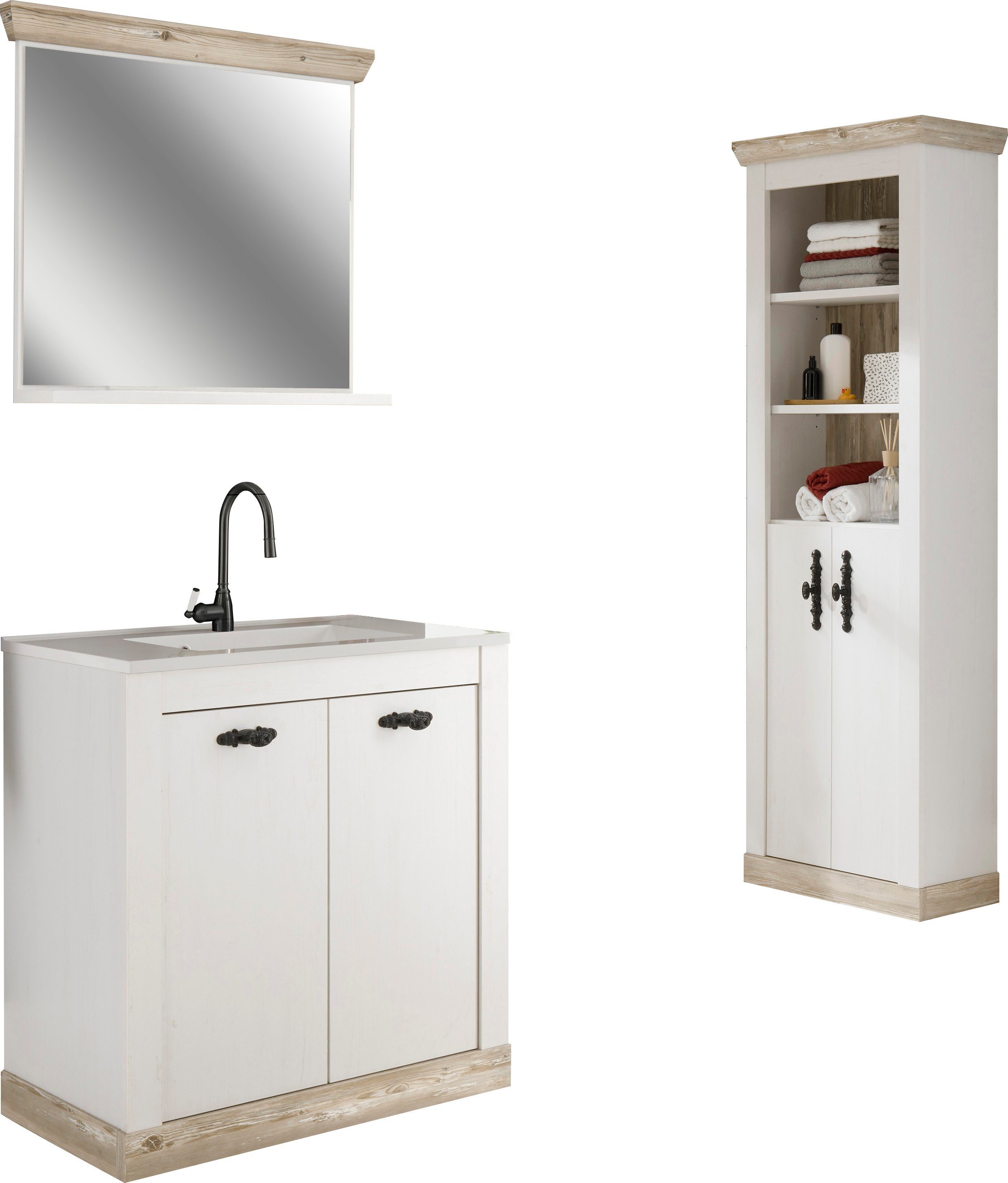 Home affaire Badmöbel-Set Florenz, Bad im Landhausstil, 3-teiliges Badezimmer, (3-St), Waschtisch, Schrank und Spiegel mit Ablage, in Pinie Weiß, Stauraum