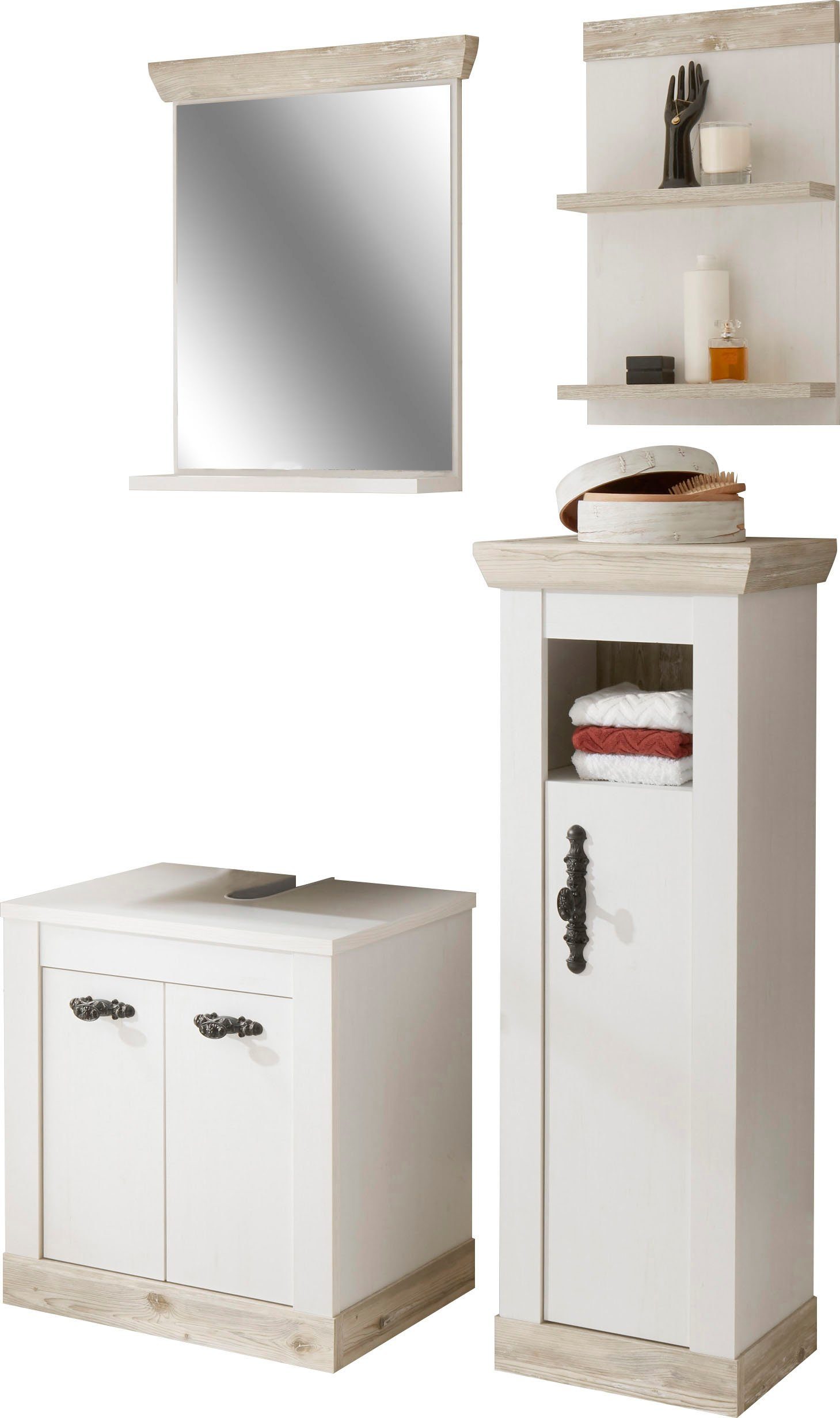 Home affaire Badmöbel-Set Florenz, Bad im Landhausstil, 4-teiliges Badezimmer, (4-St), Unterschrank, Schrank, Wandregal und Spiegel, in Pinie Weiß, Stauraum