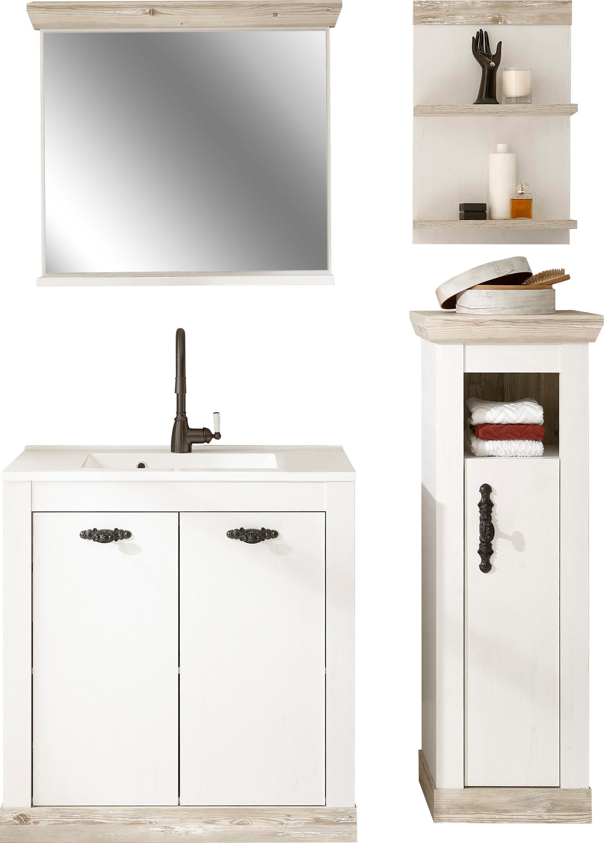 Home affaire Badmöbel-Set Florenz, Bad im Landhausstil, 4-teiliges Badezimmer, (4-St), Waschtisch, Schrank, Wandregal und Spiegel, in Pinie Weiß, Stauraum