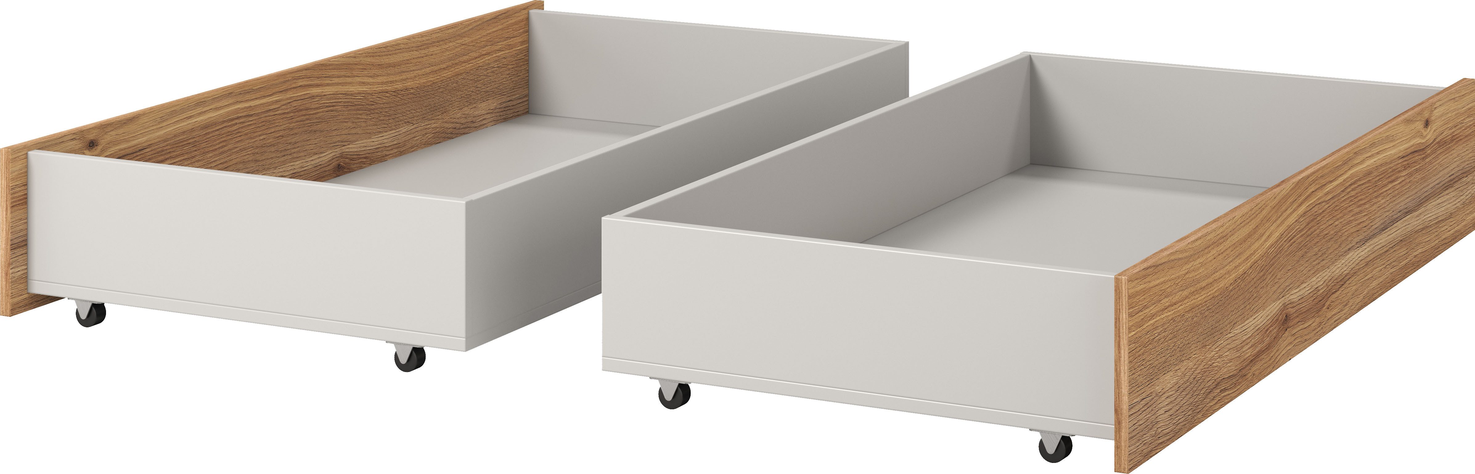 Eine praktische und stilvolle Lösung für mehr Stauraum in deinem Schlafzimmer oder Jugendzimmer: der rollbare Bettschubkasten »Wharton, Breite 125cm, viel Stauraum« von Home Affaire genau das Richtige für dich. Dieses Zubehör für Schlafmöbel bietet dir nicht nur zusätzlichen Platz für deine Aufbewahrung, sondern passt auch perfekt zum Bett aus der gleichnamigen Serie. Der Bettschubkasten ist mit einer Folienbeschichtung versehen, die ihn äußerst robust und langlebig macht. Seine Fronten sind in einer attraktiven Holzoptik gehalten, die in jedem modernen Wohnstil ein echter Hingucker ist. Als besonders praktisch erweist sich die Tatsache, dass du die Fronten beidseitig montieren kannst. Der Bettschubkasten ist auf Rollen gelagert, was dir die Möglichkeit gibt, ihn einfach und unkompliziert unter dem Bett zu platzieren. Bei Bedarf kannst du ihn problemlos hervorziehen und auf seine rollenden Beine stellen. Egal ob du ihn als Ergänzung zum gleichnamigen Bett verwendest oder einfach so – mit dem rollbaren Home Affaire Bettschubkasten »Wharton, Breite 125cm, viel Stauraum« bringst du Stil und Ordnung in deinen Wohnraum.;Wenn du nach einer Lösung für mehr Platz in deinem Schlafzimmer suchst, ist der Bettschubkasten »Wharton« von Home Affaire mit praktischen Stauraum zur Aufbewahrung genau das Richtige für dich. Mit seiner Folienbeschichtung und der beidseitigen Montiermöglichkeit bietet dieser Bettschubkasten einen praktischen und flexiblen Stauraum. Gleichzeitig ist er auch ein hervorragendes Zubehör für Schlafmöbel. Seine besondere Eigenschaft beinhaltet die Bettschubladen im 2-er Set, die deine Aufbewahrungsmöglichkeiten deutlich erweitern. Hergestellt wurde dieser Schubkasten mit Fronten in Holzoptik und einer Folienbeschichtung, die dem Bettschubkasten eine elegante Optik verleihen. Ebenso eignet er sich für das Jugendzimmer und fügt sich mit seinem modernen und retro Wohnstil nahtlos in dein Zuhause ein. Dabei ist besonders hervorzuheben, dass der Bettschubkasten auf Rollen kommt und frei unter dem Bett im Schlafzimmer positionierbar ist. Der Bettschubkasten »Wharton« von Home Affaire ist die richtige Wahl für alle, die sich mehr Stauraum in ihrem Schlaf- oder Jugendzimmer wünschen. Seine beidseitige Montierbarkeit und sein großzügiger Stauraum machen ihn zu einer praktischen und stilvollen Ergänzung für jedes Schlafzimmer.