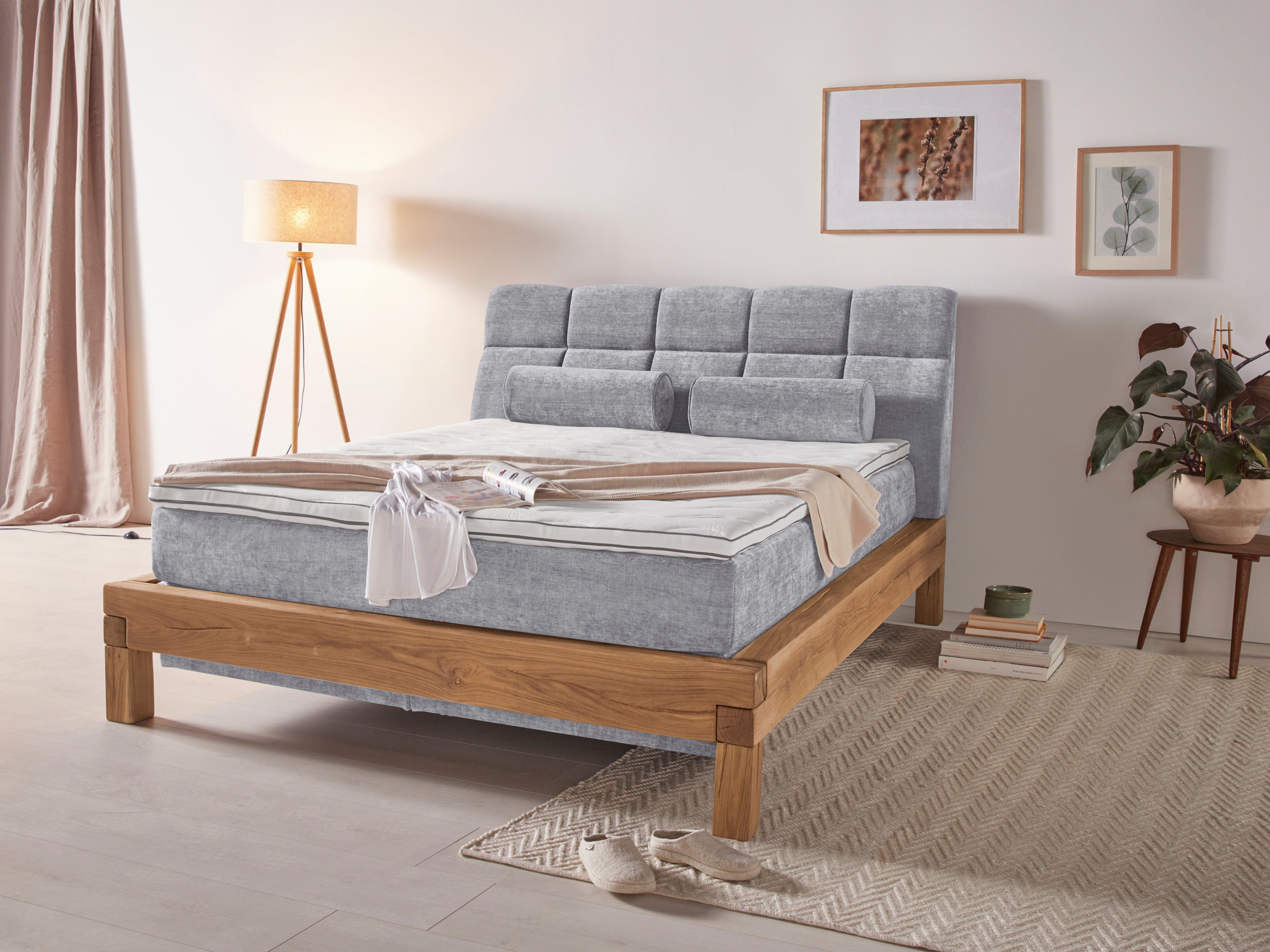 Wissenswertes | Bezugsstoffe aus 100 % Recycling-PET, GRS-zertifiziert. Das Gestell der Unterbox ist aus massiver Balkeneiche gefertigt. Dadurch sehr robust und langlebig. Jedes Bett ist duch seine spezielle Art ein Unikat welches handwerklich sehr hochwertig gefertigt wird. Als Unterfederung wird ein hochwertiger 5-Gang Bonellfederkern (mit Qualitätsschaumstoff und Vlies abgedeckt) verwendet. Lieferung ohne Nachttisch »Villads«, bitte extra bestellen. Taschenfederkernmatratzen mit 7-Zonen, optimale Körperanpassungsfähigkeit, hervorragende Punktelastizität durch kleine sensible Federn, die einzeln in Taschen eingenäht sind. Grundsätzlich wird ein hochwertiger Antirutsch als Matratzenbremse eingesetzt. In Härtegrad 2, 3 & 4 wählbar. |