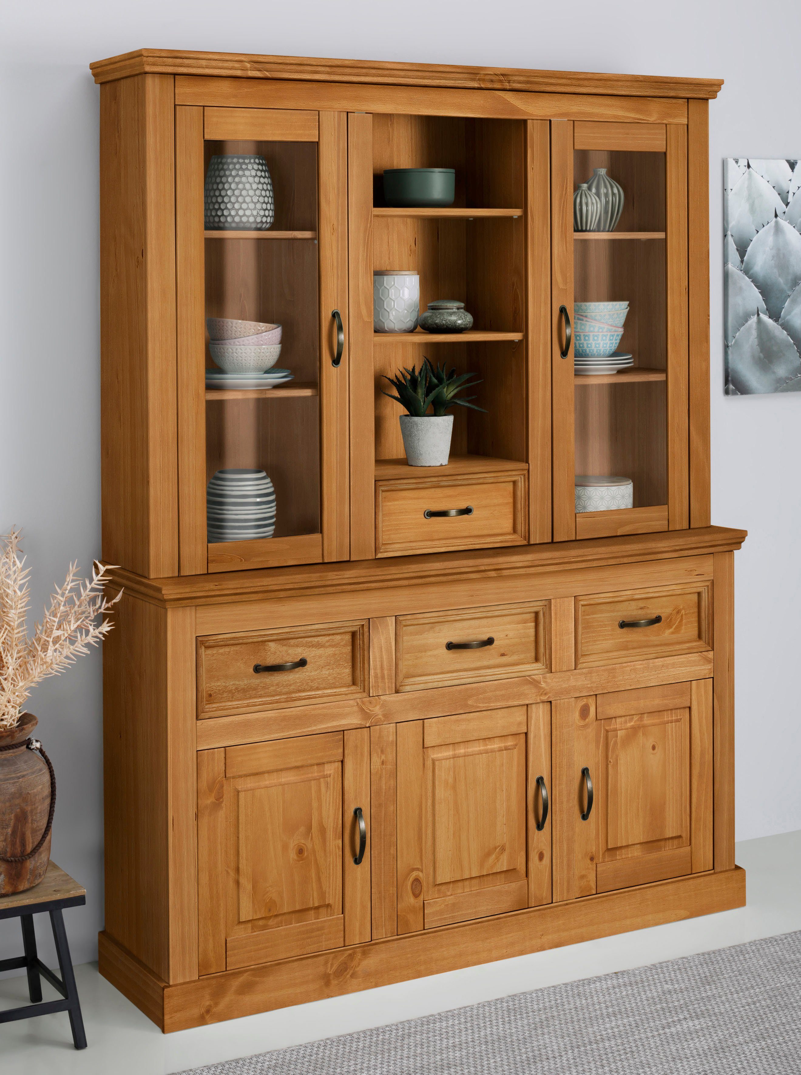 Dieses Buffet »Selma« von Home affaire hilft dir dabei, dein Geschirr zu lagern und hübsch zu präsentieren. Die Schubladen lassen sich komplett ausziehen und bieten dir weitere Unterbringungsmöglichkeiten. Um den Schrank genau auf deine Bedürfnisse auszurichten, sind die Einlegeböden flexibel einsetzbar. Das Wachs auf der Oberfläche macht das Holz unempfindlicher gegen Schmutz und Feuchtigkeit. Die Griffe aus Metall sind langlebig und unterstreichen den Stil. Bei etwa 150 Kilogramm liegt die maximale Belastbarkeit.