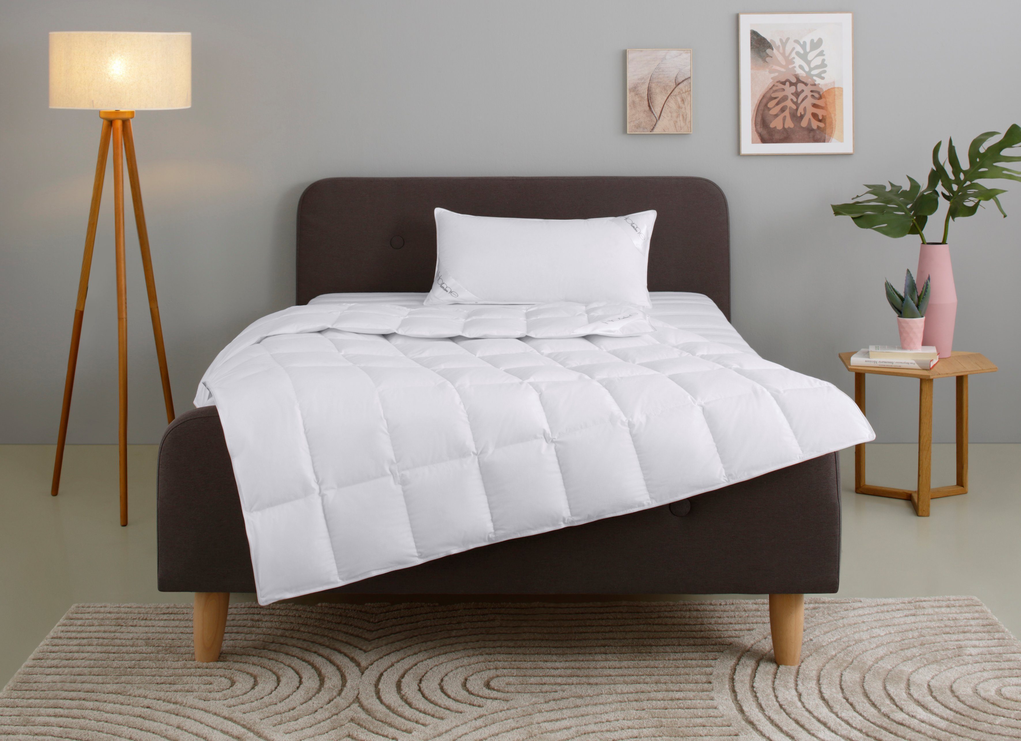 Materialzusammensetzung | Bettdecken Bezug: 100% Baumwolle. Kopfkissen Bezug: 100% Baumwolle. Bettdecken Füllung: 100% Gänsedaunen. Kopfkissen Füllung: 70% Gänsefeder, 30% Gänsedaunen |