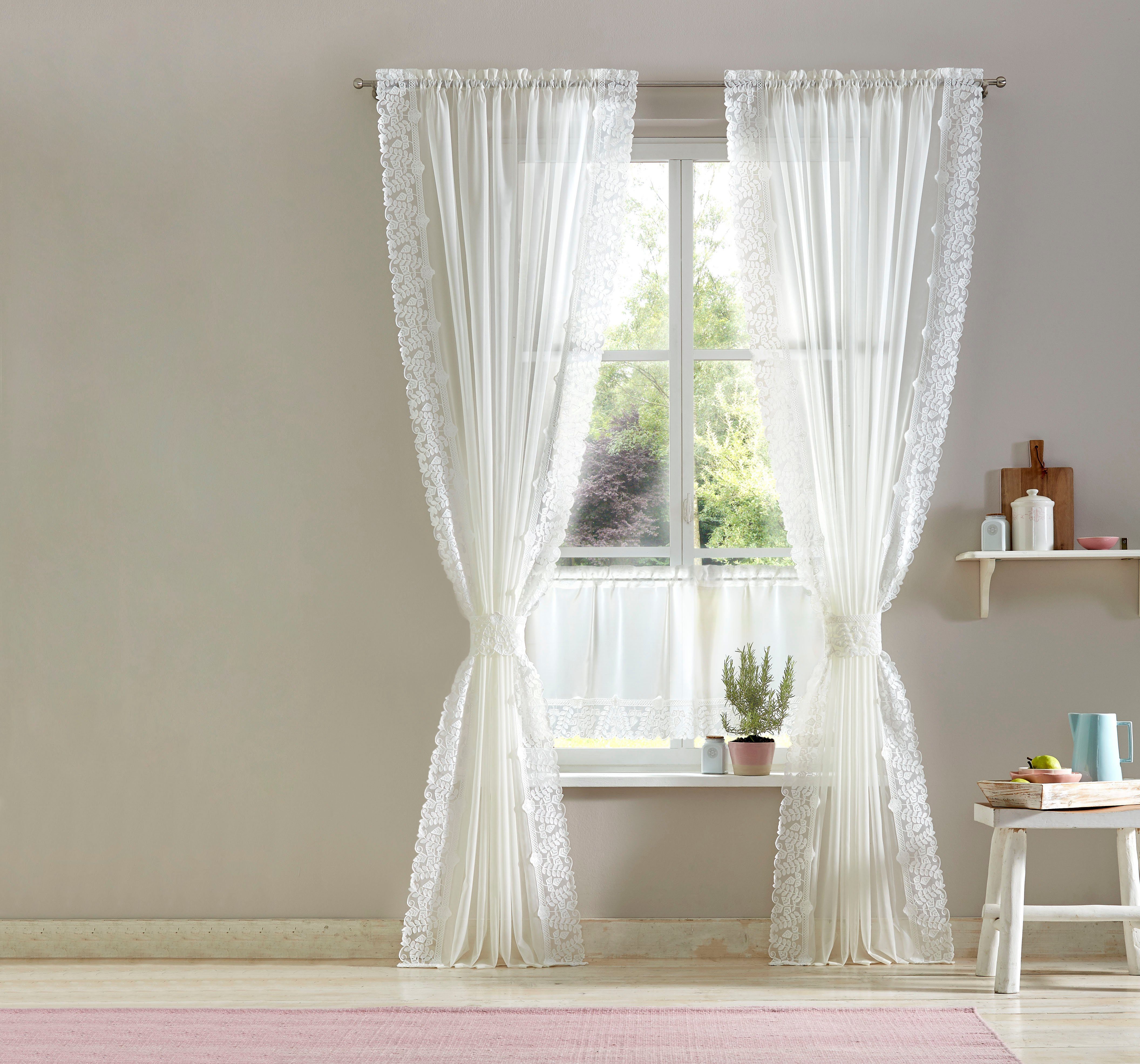 Hinweis Dekoration | Am Fenster fertig dekoriert, reduziert sich die Breite um ca. die Hälfte. Die angegebenen Maße sind Stoffmaße. |