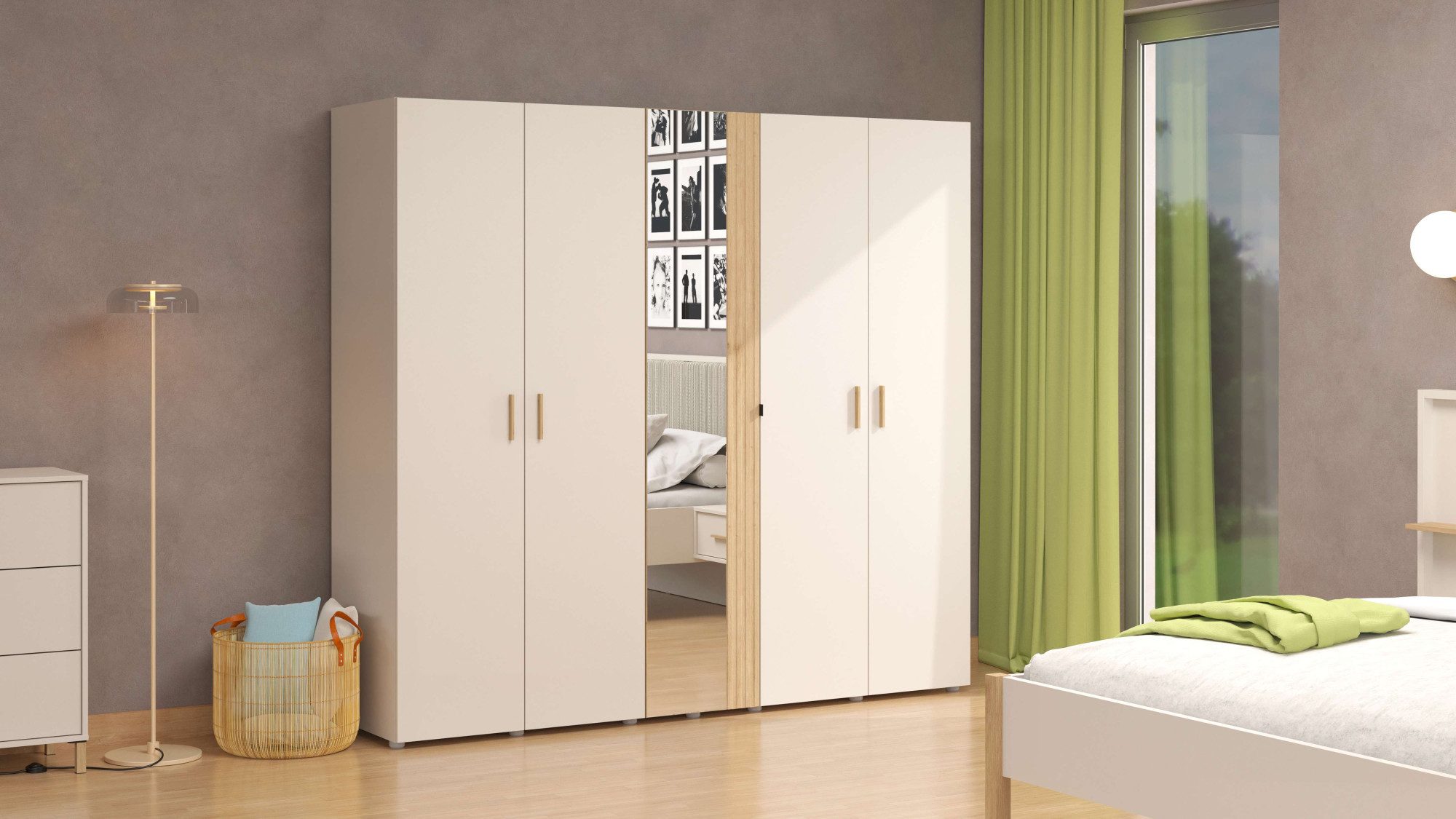 Dank der Spiegeltüren benötigst du nicht noch einen extra Spiegel im Raum um deine Kleidung zu betrachten. Befestigt werden die Türen mit hochwertigen Scharnieren aus Metall. Maximale Flexibilität bieten dir die variabel einsetzbaren Einlegeböden. Dadurch bleibt es dir überlassen, wie hoch die einzelnen Fächer sein sollen.