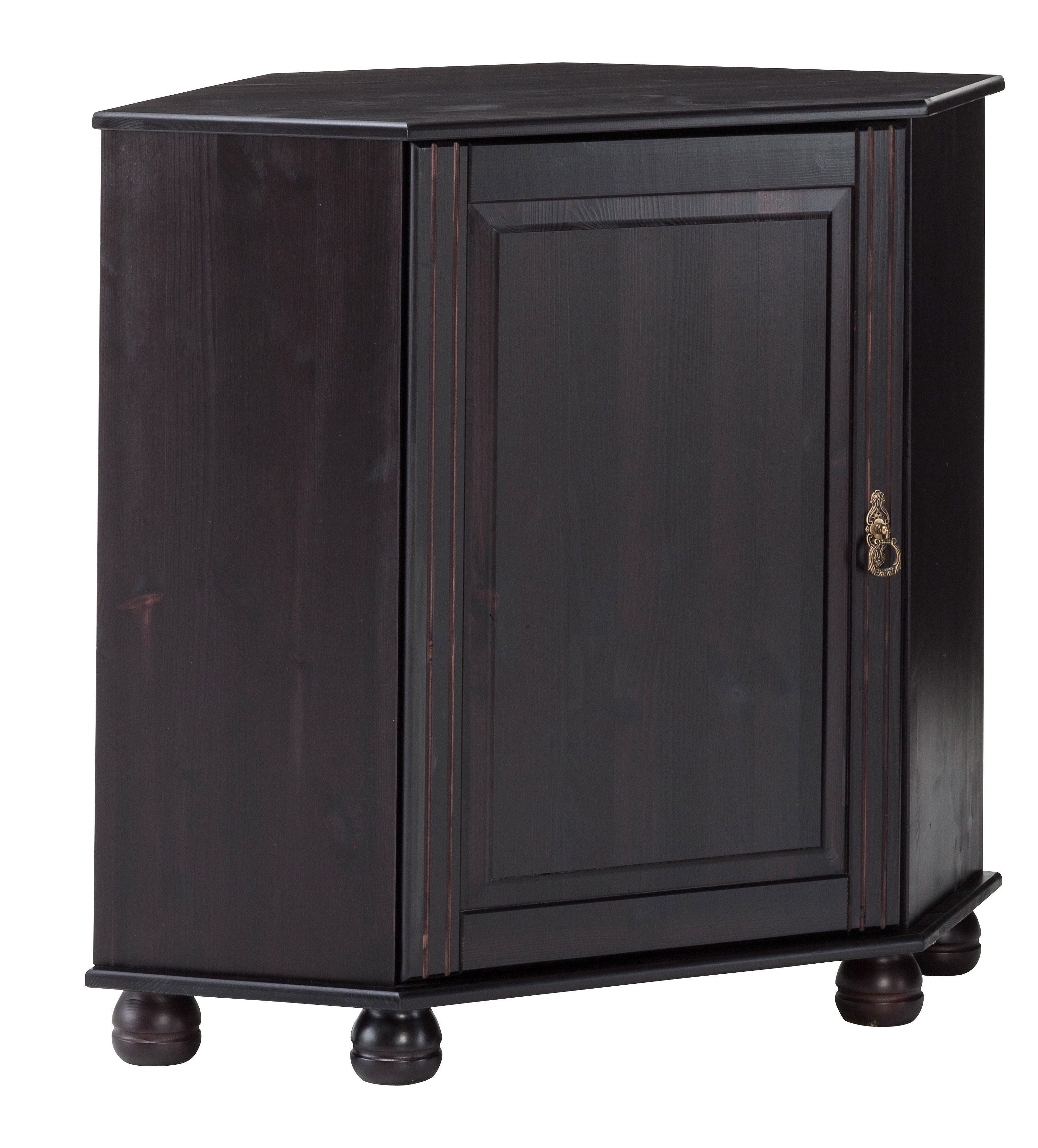 Wissenswertes | Eckkommode »Finca«. Tolle Dielenmöbel im Landhaus-Stil. Aus FSC®-zertifizierter, massiver Kiefer, wahlweise gelaugt/geölt, dunkelbraun oder weiß lackiert (Äste leicht sichtbar). Griffe aus Metall. Höhe der Kugelfüße 6,5 cm. Eckkommode. Hinter der Tür ein verstellbarer Einlegeboden, Fachinnenmaße (B/T/H): 84/45/33,5 cm. Schenkelmaße 65/65 cm. Seitentiefe vorn 27 cm. Breite Türfront 48 cm. , Außenmaße (B/T/H): 90/50/80 cm. Material/Qualität: