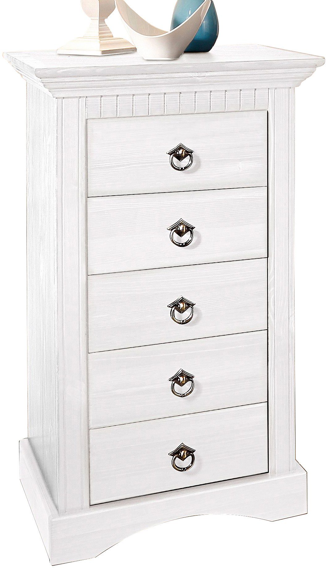 Wissenswertes | Kommode »Rustic«. Mit 5 Schubkästen Kiefer massiv und FSC®-zertifiziert. In gelaugt/geölt, dunkel gebeizt im Lodge-Stil oder weiß gebeizt und lackiert (Struktur sichtbar). Mit dekorativen Fräsungen, hochwertigen Metallgriffen sowie Schubkästen auf Metallauszügen. Innenmaße (B/T/H): je 27/30/8 cm. Gesamtmaße (B/T/H): 48/38/81 cm. Всеs ca.-Maße. Mit Aufbauanleitung. |
