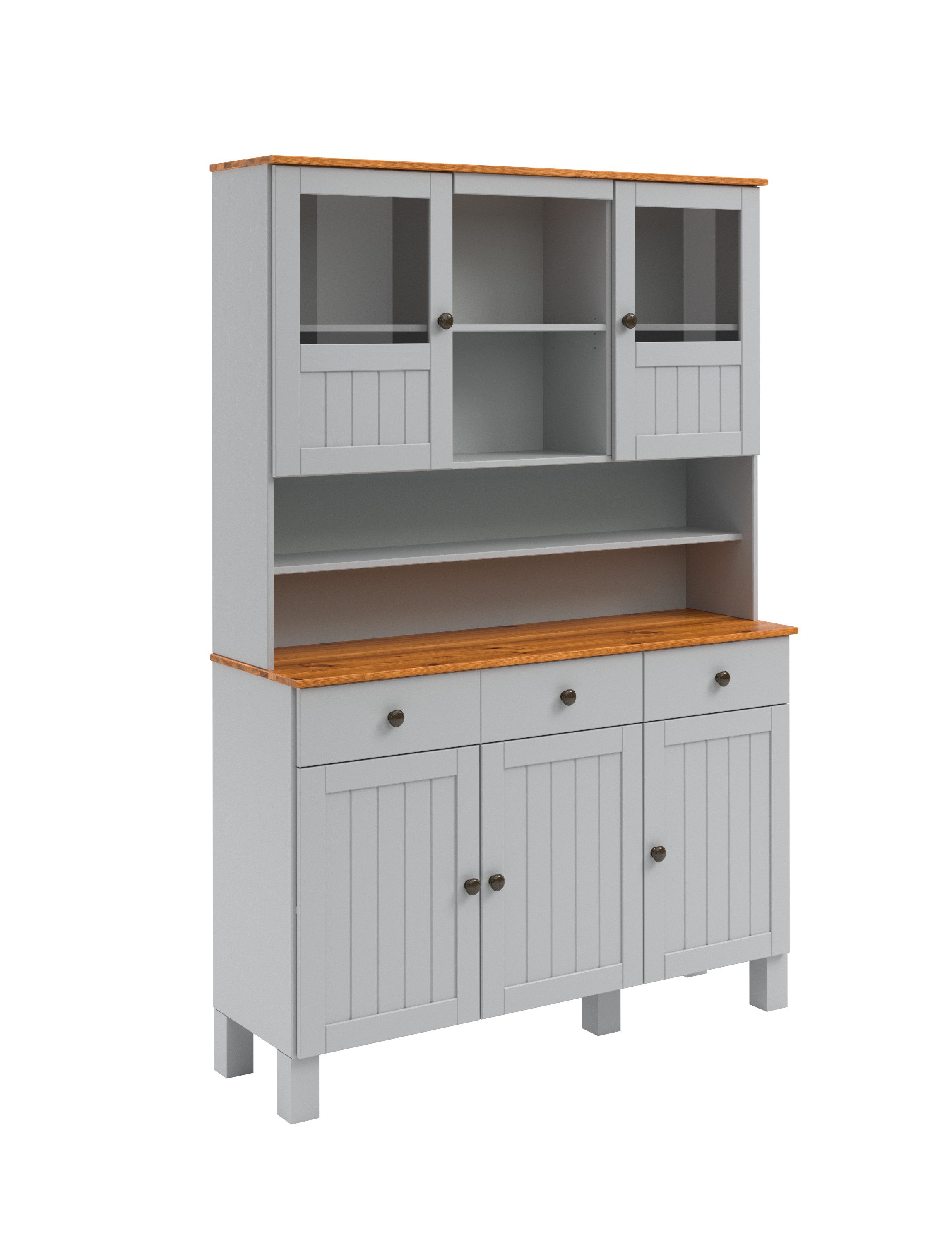 Rustikal und gemütlich zugleich — das Küchenbuffet im Landhausstil lässt sich gut mit naturbelassenen Hölzern und natürlichen Stoffen wie Leinen, Baumwolle oder Flachs kombinieren. Auflockernde Farbtupfer können beispielsweise mit Deko-Elementen wie bunten Vasen oder Kerzen eingebracht werden. Er gehört zur Alby2 Serie, die weitere Artikel in diesem Stil enthält. So kannst du ein harmonisches Gesamtbild zaubern.