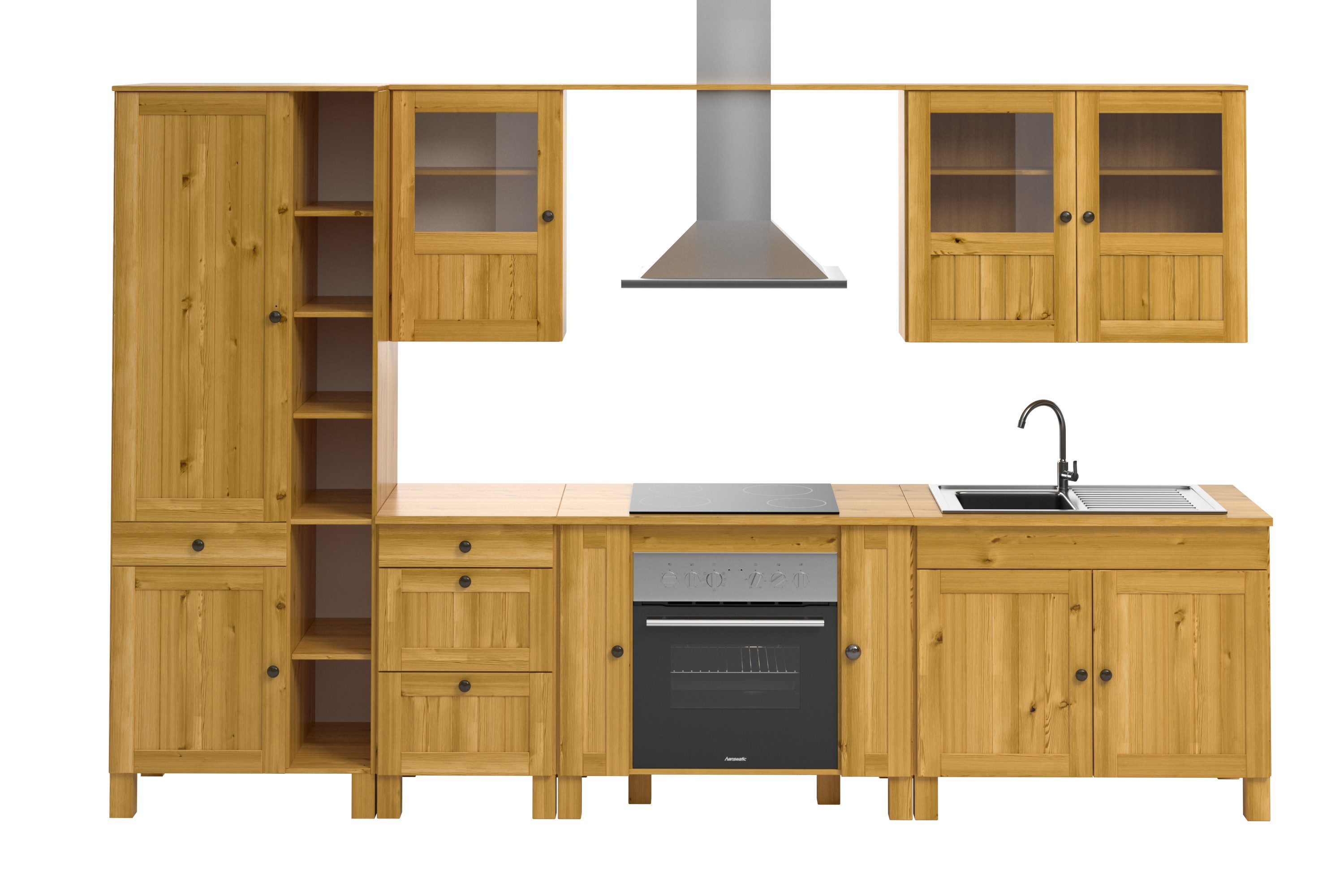 Set beinhaltet | 2 Hängeschränke mit Sprossen-Glastür und Einlegeböden, einem Spülenschrank inklusive Spüle, Herdumbauschrank mit Türen und Fächern inwendig, einem Unterschrank mit Auszügen, einem geräumigem Hochschrank mit diversen Fächern, Türen und Schublade sowie einer Deckplatte für die Dunstabzugshaube. |