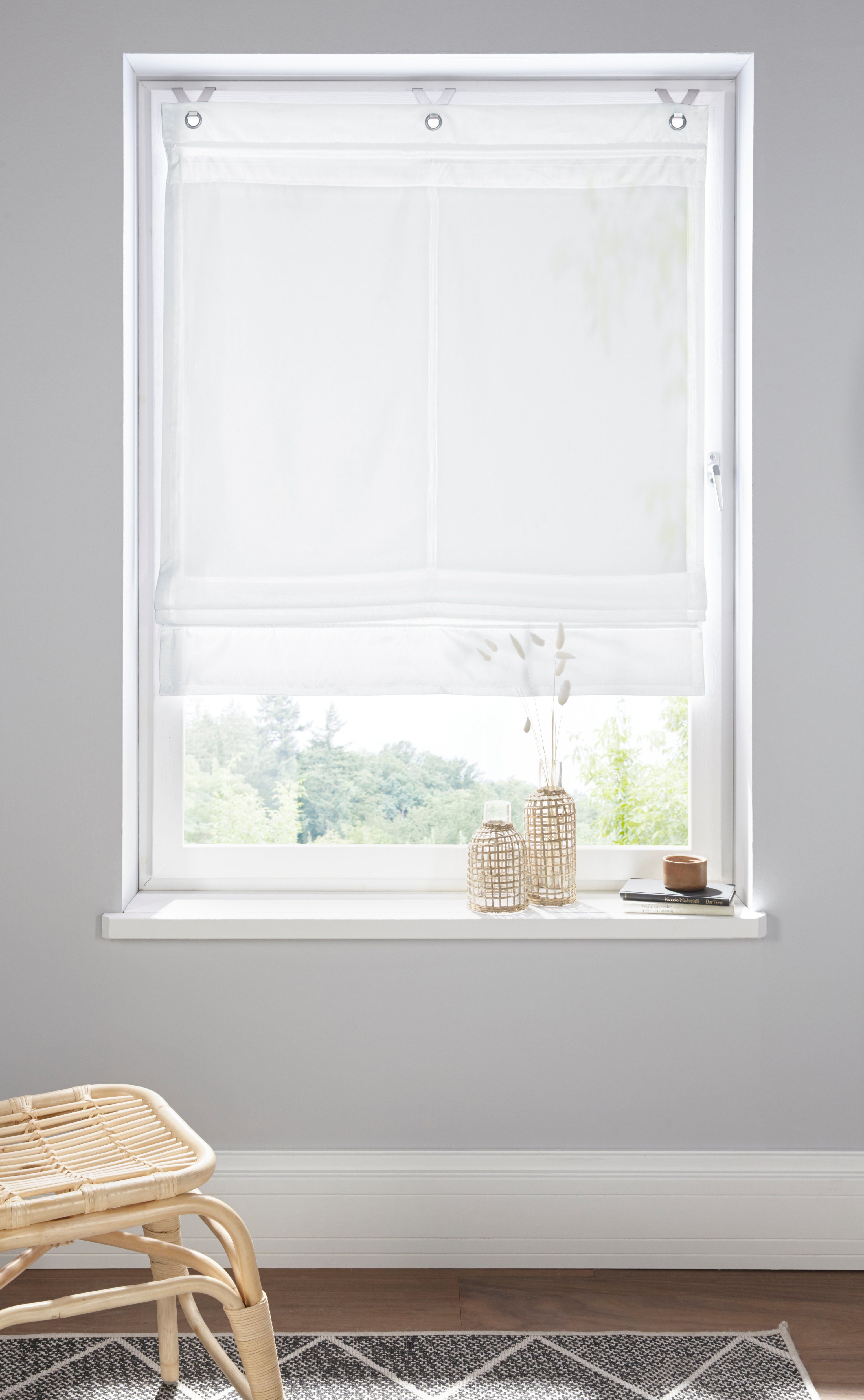 Hinweis Aufhängung | Die mitgelieferten Halterungen werden in den Fensterrahmen eingehängt und das Rollo an den dekorativen Ösen einfach eingehakt. Geeignet für Fensterflügelstärke zwischen 13 mm und 19 mm. |