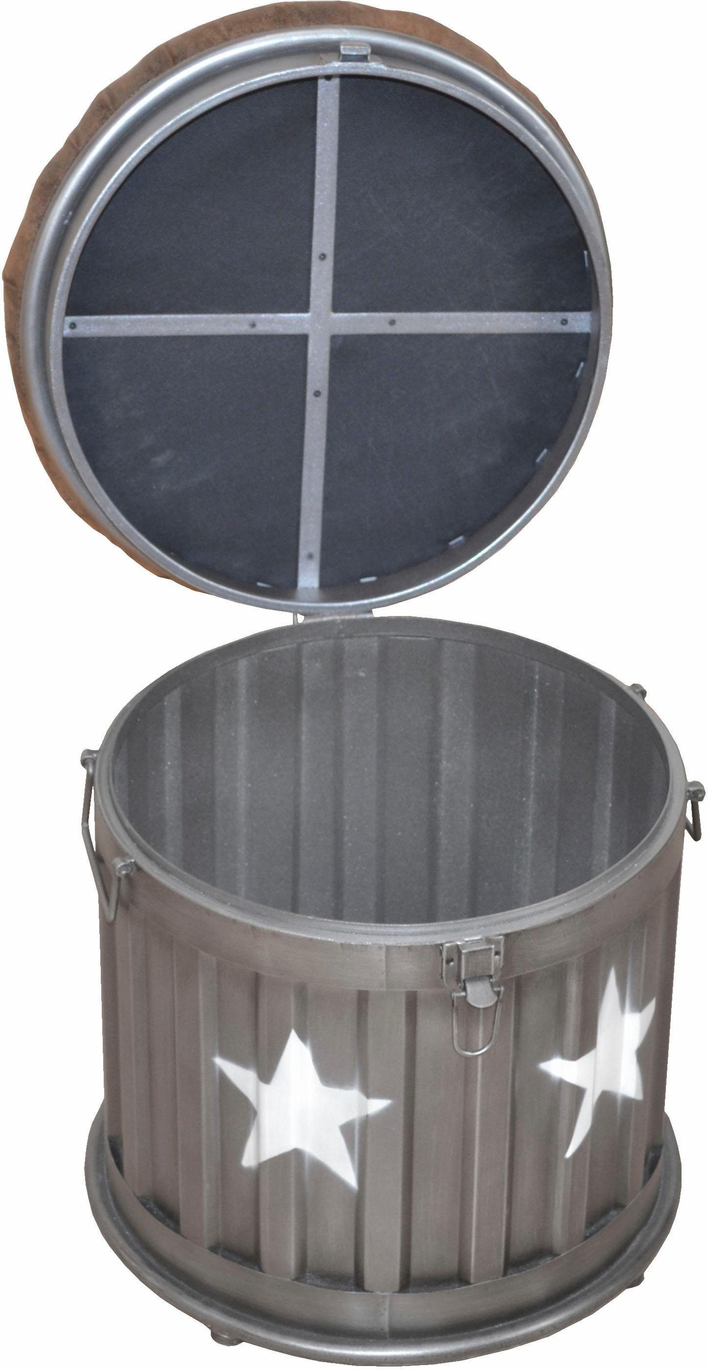 Information Materialzusammensetzung | Stabile Sitzgelegenheit mit Mehrwert: Der Sitzhocker von Home affaire mit Stauraum begeistert durch seine stabile Konstruktion. Zudem handelt es sich bei diesem Hocker um ein praktisches 2-in-1 Möbelstück. Die Sitzfläche lässt sich nämlich einfach hochklappen. Darunter befindet sich reichlich Stauraum. Für eine sichere Standfestigkeit sorgt zudem der Verschluss, mit dem die Sitzfläche an dem Unterteil des Hockers befestigt wird. Dank der beiden seitlichen Tragegriffe lässt sich das Kleinmöbel leicht transportieren. Neben der Funktionalität überzeugt das Möbelstück durch seine Optik: Der Hocker ist im Industrial-Stil gefertigt. Als besondere Highlights sind Sterne auf die Tonne aufgedruckt. Der Sitzhocker von Home affaire mit Stauraum passt hervorragend in ein junges Wohnambiente. |